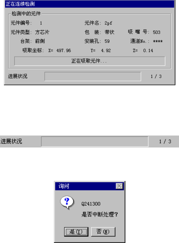 连续检测过程中显示如下画面。显示连续加车的元件内容及吸取位置,依次显示处理内容。