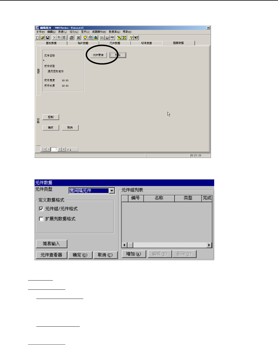 第2部 功能详解篇 第6章 通用图像 6-5 6-2-1 元件组/元件格式的制作 在图6-2-2的画面中单击“追加”按钮,显示如下画面。 图 6 -2-3 元件组制作画面 1) 名称:请输入元件组名,英文、数字字符最多 32 个。 2) 首元件位置:输入由元件识别中心位置到首元件的距离。 ●偏移量 ◇X,Y: 当为多引脚元件时,输入到首元件的顶端中心的距离;当为复合阵列元件时,输 入到首元件中心的距离。 ※ 请正确输入尺寸。 如果元件组…