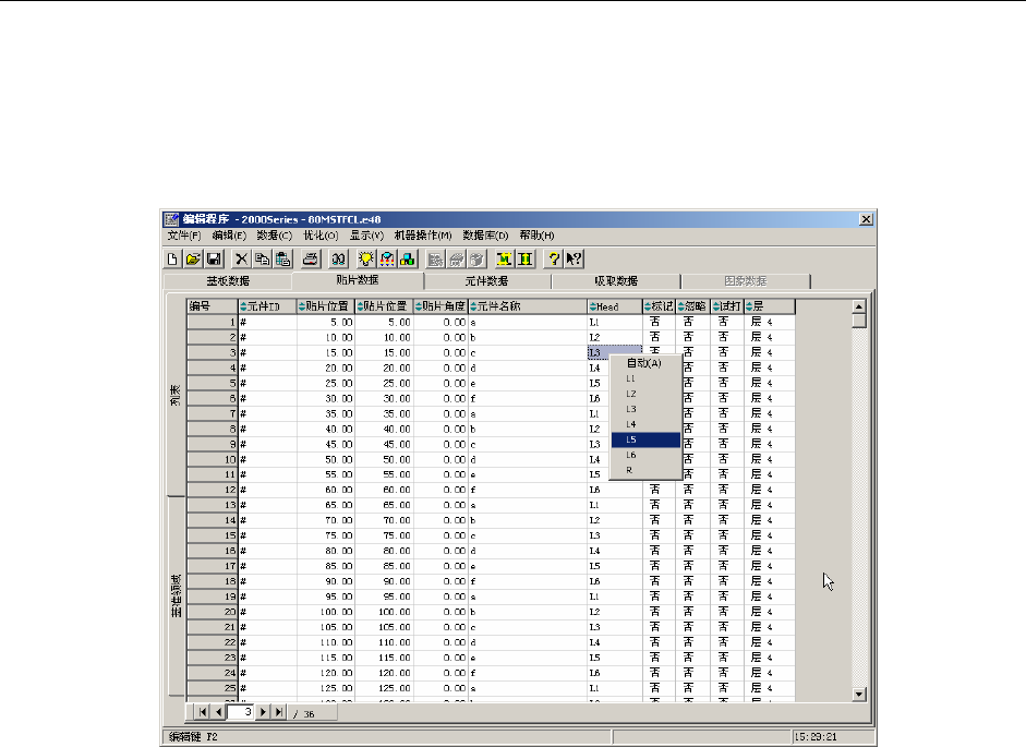 下图为程序编辑的贴装数据编辑画面。选择图像识别元件的贴装点,指定贴片头为 LNC60 贴片头(L1~