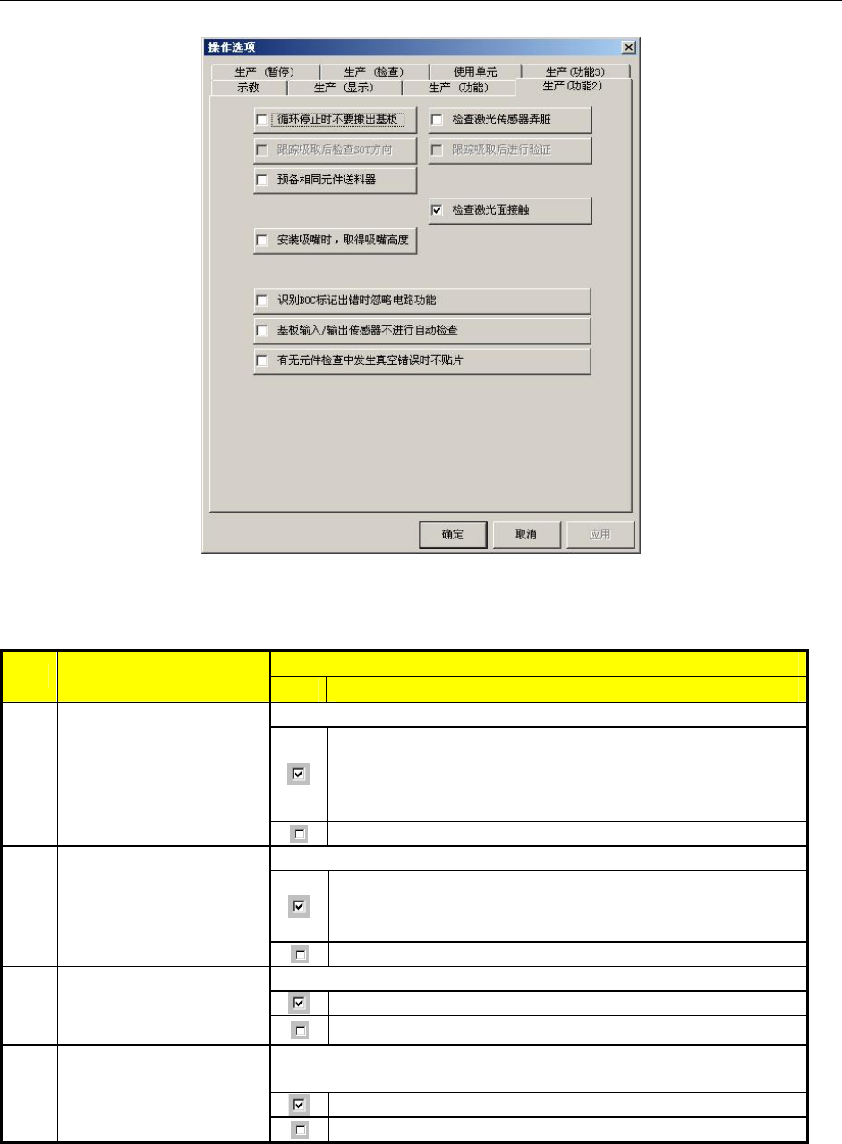 第2部 功能详细编 第7章 操作选项 7-7 设置在所有电路识别出坏板标记时, 是否中断生产。 7 所有电路都是 坏板标记时结 束生产 即使生产未达到预定数量, 也要结束生产。因为可以推断是“坏板标 记位置信息错误” 、 “传感器的调整不 良或故障”等出现异常。 设置安装吸嘴时是否执行方向检测。 8 安装吸嘴时进 行方向检测 T 型等吸嘴需要对准元件的角度吸取,可在安装吸 嘴时测量吸嘴的安 装方向, 对吸取、识别、 粘贴元件时的吸嘴安装…