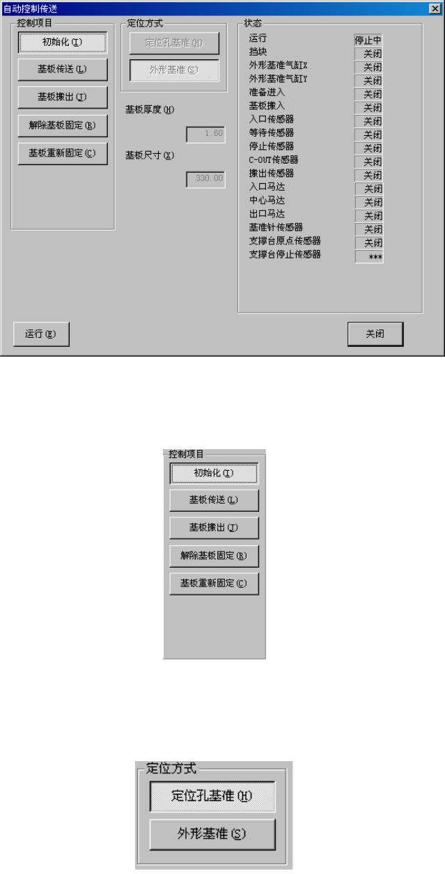 第 2 部 功能详细编 第 9 章 手动控制 (3) 控制按钮 用控制按钮来执行控制项目。 选择控制项目后,按“执行(E )”按钮或按下“F3”键进行控制。 1) 初始化 将基板传送初始化。 2) 基板搬入 根据定位方式中所指定的方式搬入基板。 3) 基板搬出 将基板搬出。 4) 基板固定解除 解除基板的固定。 5) 重新夹紧基板 按定位方式指定的方式,重夹传送通道上的基板。 6) 基板等待/搬出传感器检查 把在IN缓冲区上(入口马达传…