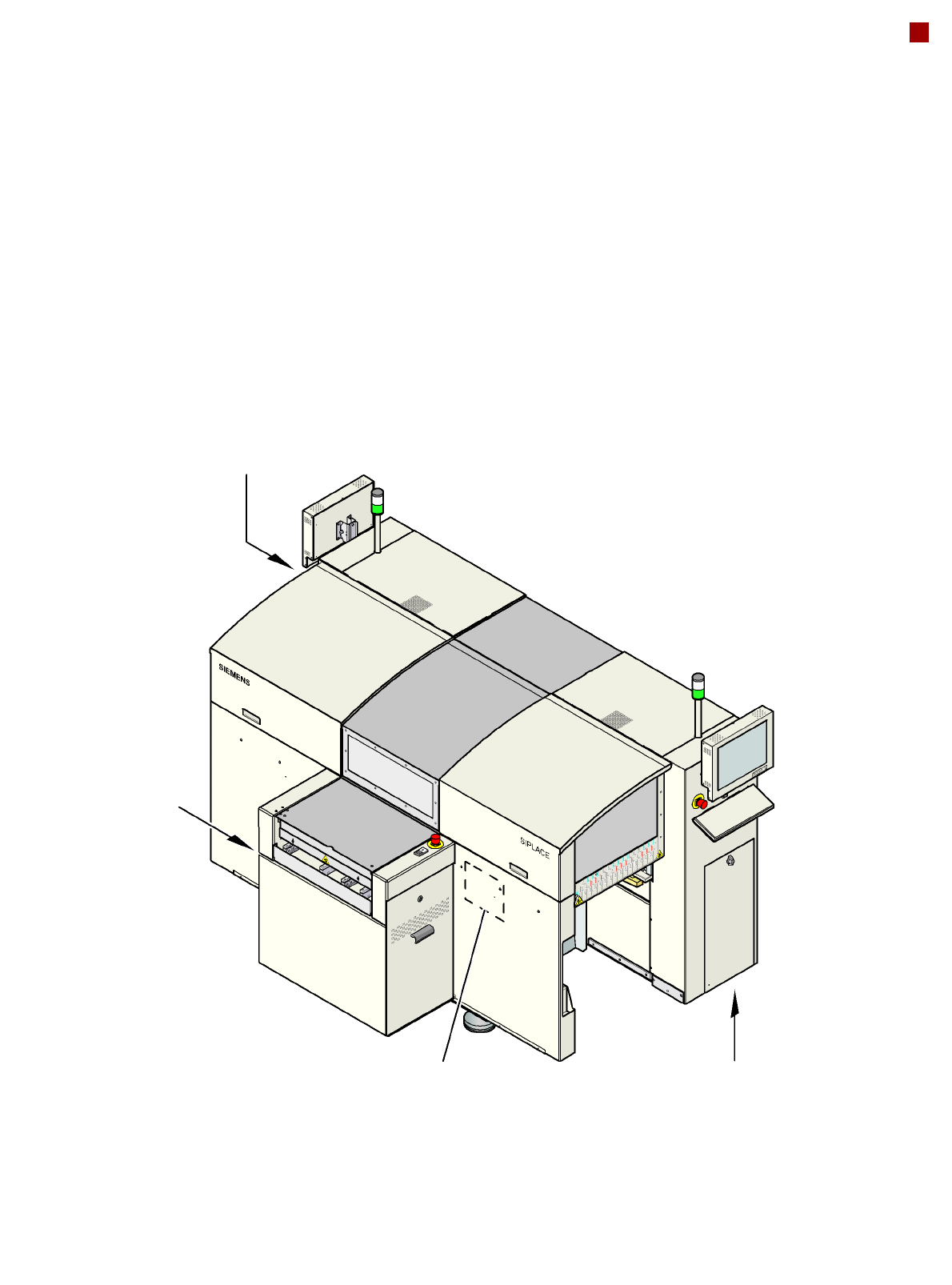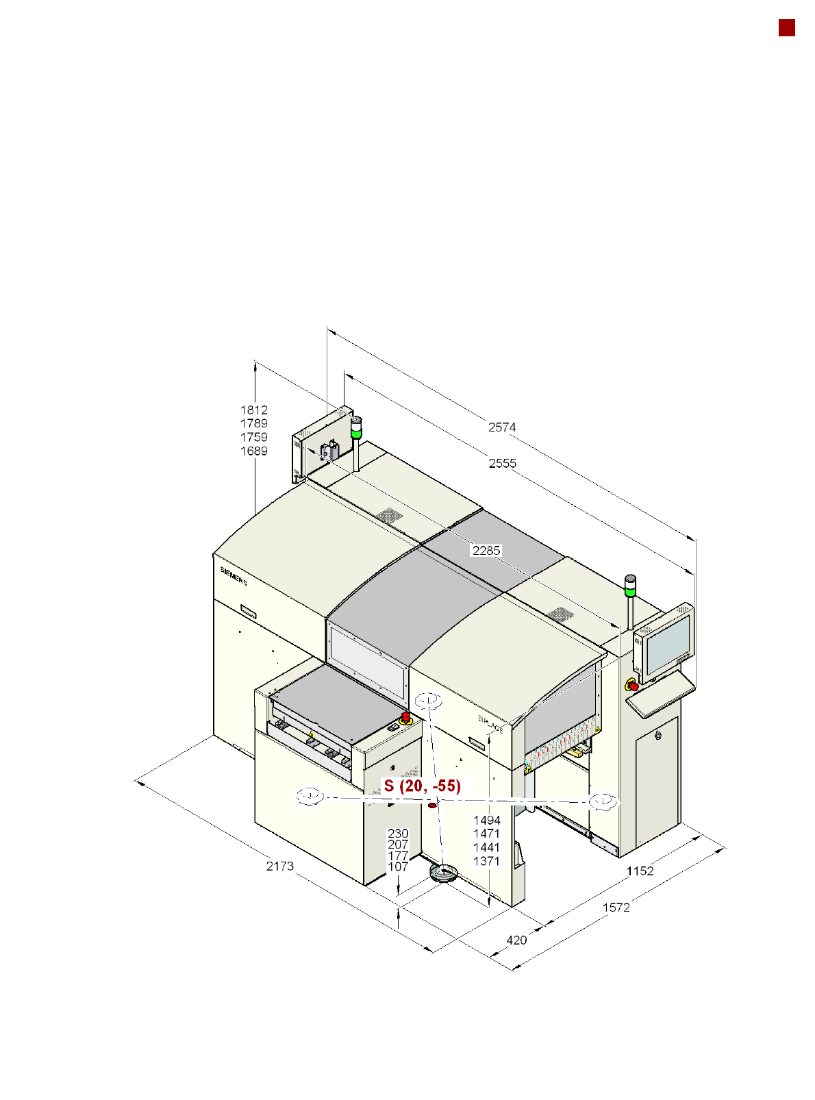 34 Technical Data Dimensions and Set-up Conditions Length of the basic machin e 1572 mm Width of the basic mac hine with component changeo ver table including mo nitors with keyboards 2285 mm 2560 mm 2555 mm 2574 mm Heig…