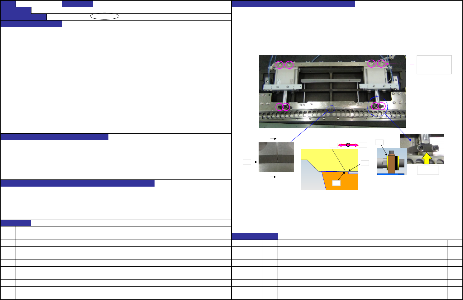 QA表 机种 在EDGE_BASE_SIDE与BANK_BASE之间插入垫隙片进行调整。 调整用的垫隙片如下所示 设置切断料带时的预压 ・ 切断不良 ・ 活动刀刃的动作不良 ・ 寿命降低 NO ① ② NO. 担当人 ③ ④ ⑤ ⑥ ⑦ ⑧ ⑨ ⑩ 确认方法及调整方法(故障处理方法) 功能名称 间隙调整 质量保证类别 功能 ・ 安全性 / 可靠性 / 安全性 / 商品特点 质量特性(规格调整值) 功能作用(规格调整值的意义) 预想故障(…