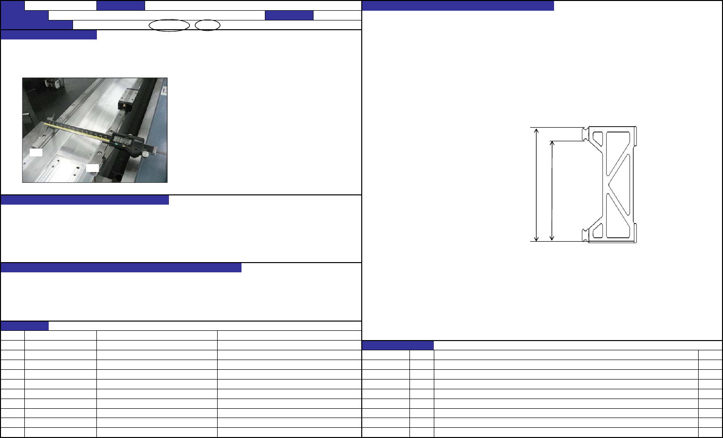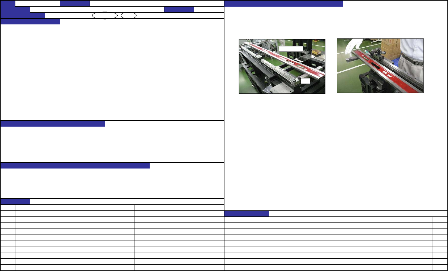 QA 表 机种 确认方法 1. 将带有千分表的磁力表架设置在下侧 LM 导轨的滑块上。 2. 使千分表触及上侧 LM 导轨之上面,在此状态下移动第 1 步设置好的滑块,确认全行程中平行度为 20 μ m 。 • 上侧 LM 导轨对下侧 LM 导轨的平行度: 20 μ m • 从下侧轨道基准面(下面)到上侧轨道基准面(上面)的距离: 137±0.1mm 调整方法 (作为替代,也可以是从下侧轨道基准面(下面)到上侧轨道下面的距离: 122±…