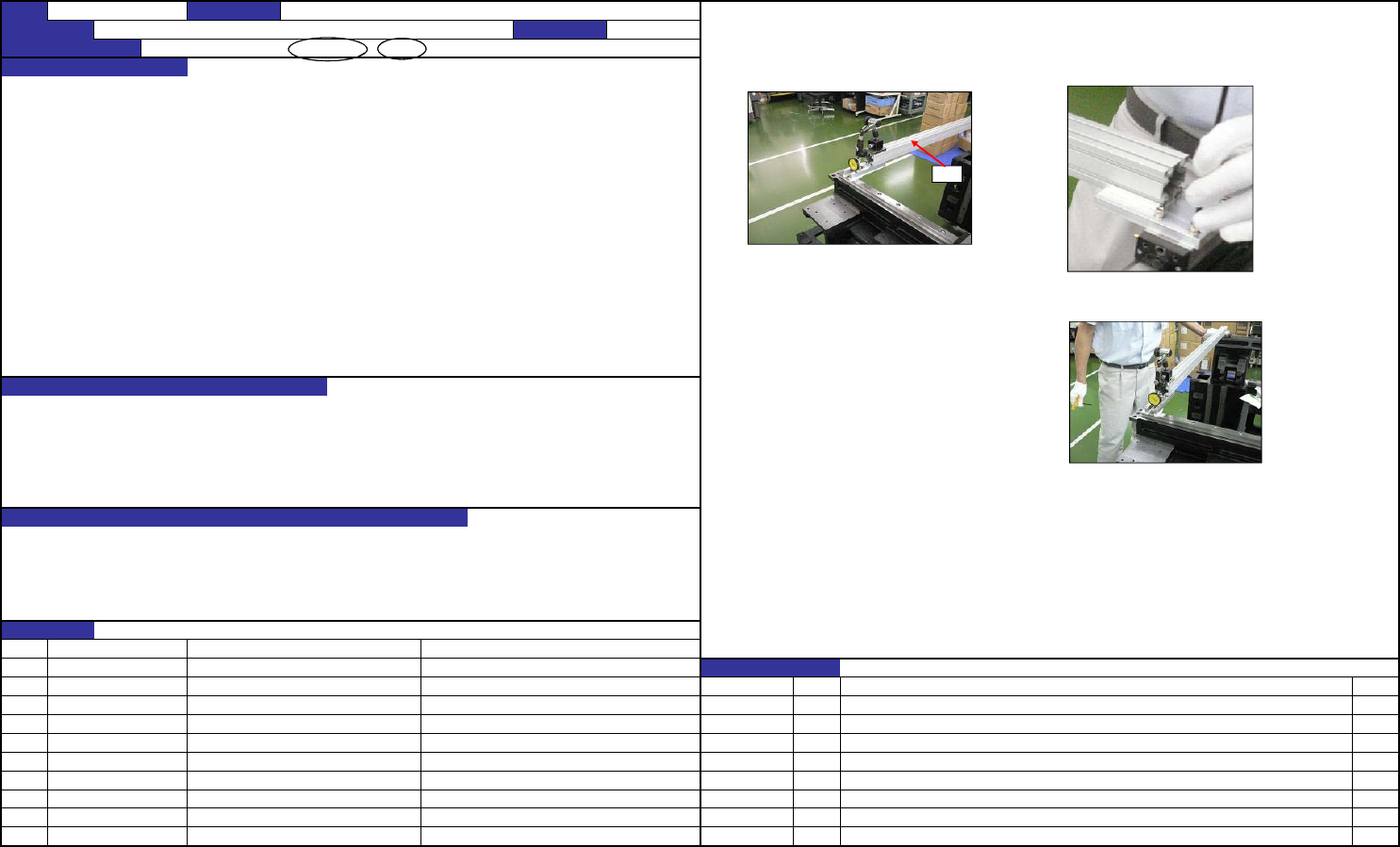 QA 表 机种 确认方法 1. 安装治具,在其上面放工字平尺。 2. 在 LM 导轨的滑块上设置带有千分表的磁力表架。 • 左侧 LM 导轨的平直度: 20 μ m 3. 安装工字平尺,使得 LM 导轨两端的千分表值为 “0” 。 4. 确认 LM 导轨的全行程中平直度为 20 μ m 。 调整方法 1. 按上述工序安装工字平尺。 2. 调整到 LM 导轨全行程中的平直度为 20 μ m 。 Y坐标有关X坐标位置的偏斜,影响X方向的贴装…
