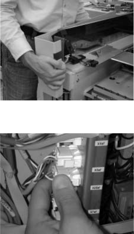 Austauschan leitung BE-Tisch-Sicherung HS-50 Ausgabe 11/2001 9 : S t ecken Sie den ne uen Stecker ein und lege n Sie das Kabel um die E cke des Bestückauto ma- ten. : Befesti gen Sie d as B efest igungsbl ech mit einer S…
