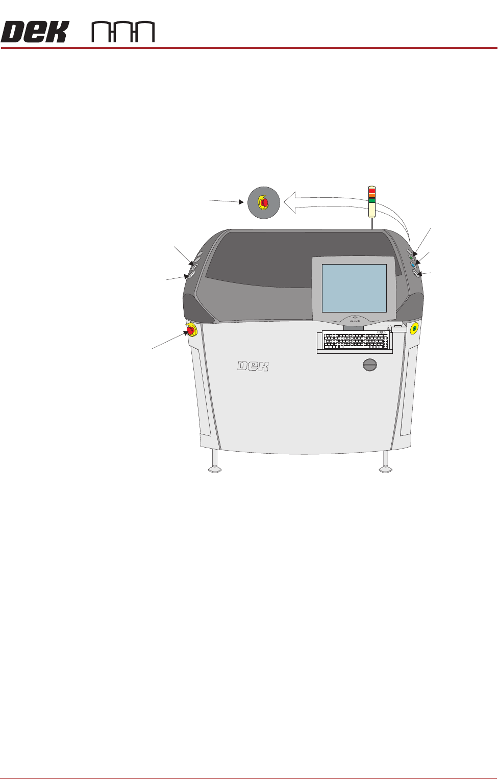 SAFETY FEATURES GENERAL Chapter Issue 4, Nov 14 Installation Manual 1.7 GENERAL DEK printi ng machines incorporate safet y features that pr ovide a safe operating environment f or the operator and the machine. EMO The ma…