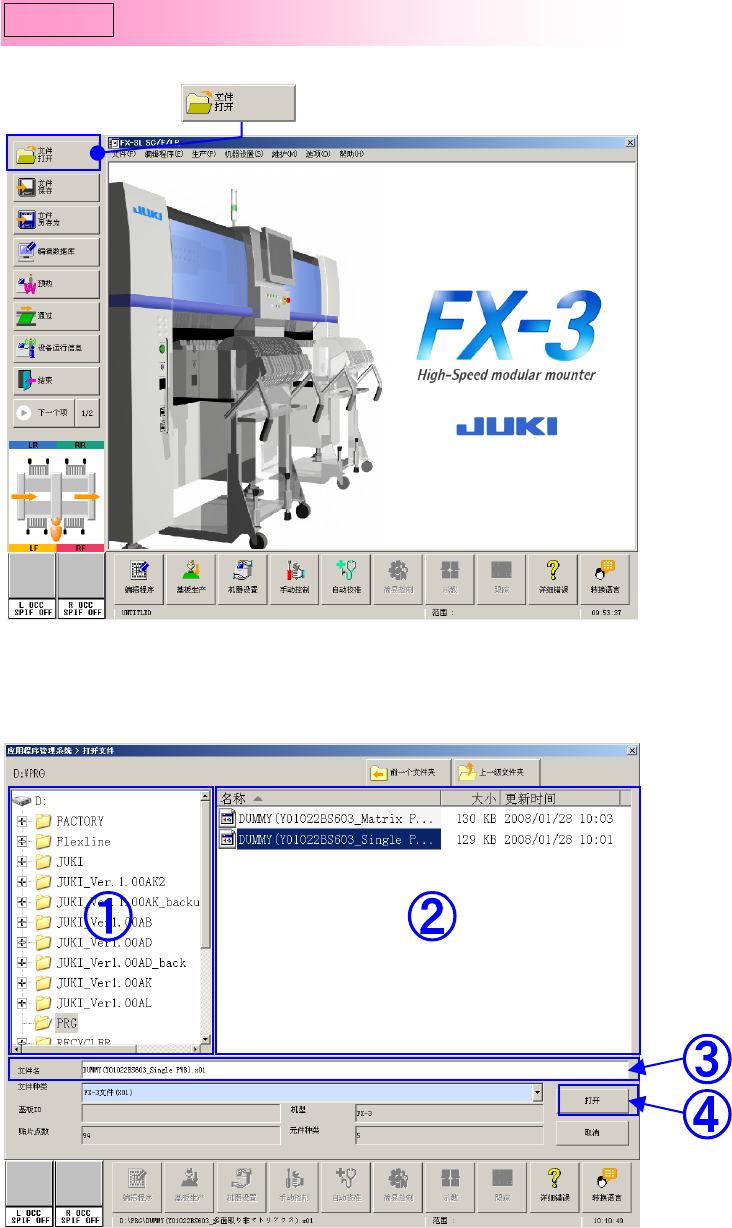 操作手册 Rev00 2- 4 ① 选择命令按钮 。 ② 显示打开文件的画面。请选择生产程序。 <步骤> ① 选择文件夹。 ② 选择文件。 ③ 确认文件名。 ④ 选择「打开」 。 Step3 读入生产程序