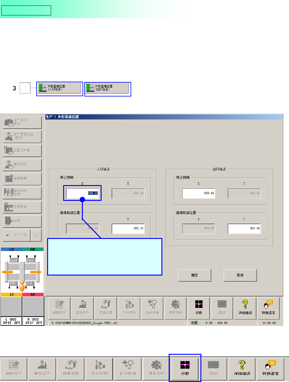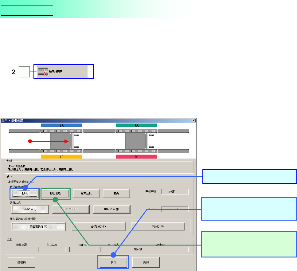 操作手册 Rev00 2- 12 2.请按下按钮「执行」 。 基板即可传入·夹紧。 选择「搬出基板」 ,按下「执行」 后,基板即可搬出。 请确认是否保持与生产时的动作同步传送基板,传送动作是否有问题。 ① 请按下按钮「基板传送」 。 ② 显示「基板传送」画面。 ③ 把基板安装在IN缓冲,确认连续动作时基板流动是否顺畅。 1.请选择 「搬入」 。 支援准备2 确认基板传送