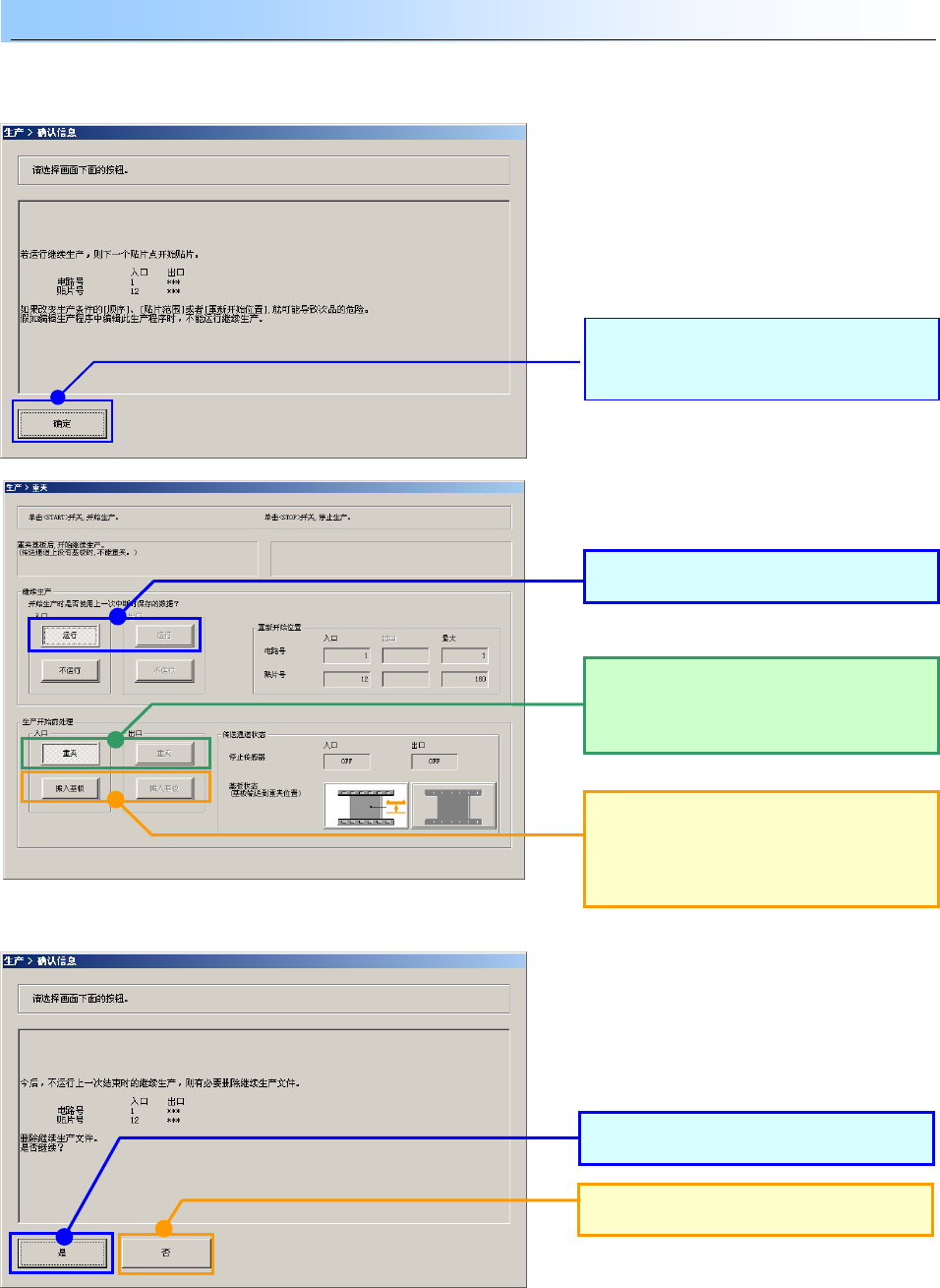 操作手册 Rev00 3- 12 生产异常结束时(发生异步现象、生产异常结 束)时,可按下列步骤继续生产。但是,这个 运行至少要 有一个元件已执行吸取·贴片后才可执行。 在生产异常结束后直接采取恢复措施按下按钮[开始开关]时,会显示下列画面。 3-11 继续生产 按下 「确 定」 按钮后, 会返回生产条 件画面。 需要继续生产时,请选 择此项。 在生产途中基板残留在中心缓冲的 状态下重新开始生产时 ,选择此项。 在生产途中基板返回到 I…