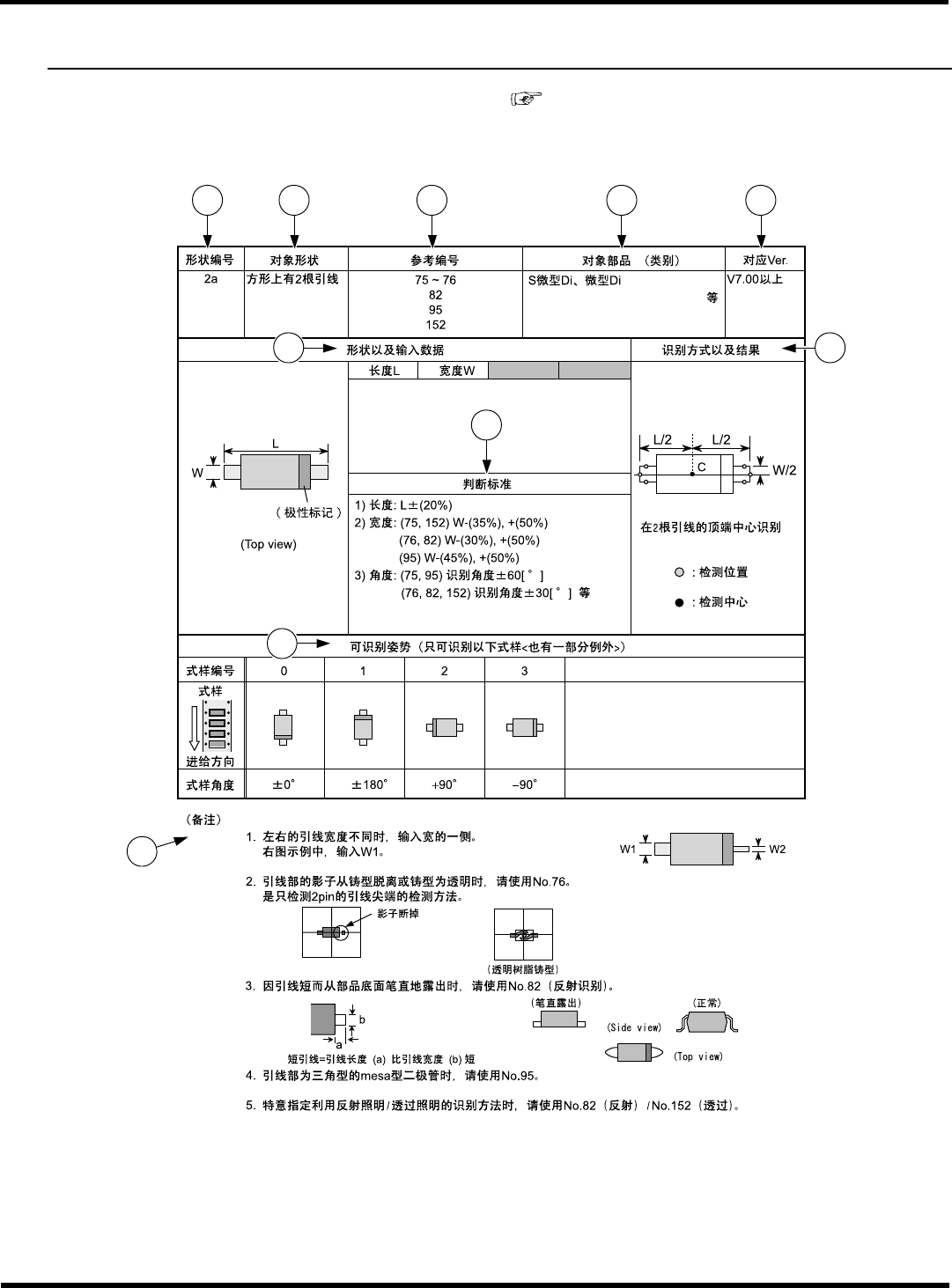 1. 芯片尺寸输入值 (长度 L) / (宽度 W) 在 1.2 以内时,自动变为形状编号“1d”的识别,可识别角度变为