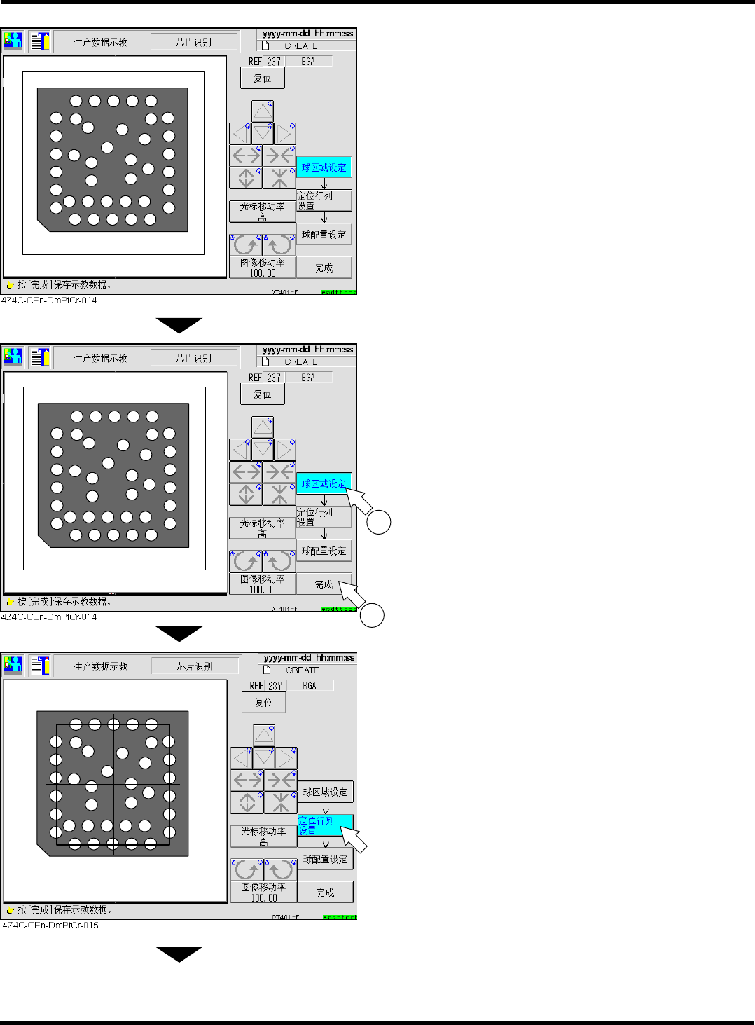 HGR14 附录 1.3 按形 状输入数据项 目 附录 1-43 < 示教 > 1. 在主菜单的 < 数据修正菜单 > 画面上按 [ 生 产数据示教 ] 。 2.Press [Chip Recoh] 3. 通过 [ 芯片选择 ] 选择对象部品后再按 UNLOCK + [ 吸着 ] 。 4. 按操作面板的 UNLOCK + [ 示教开始 ] 。 下一页 HGR14- C-PM A01-A 02-01 HGR14- …