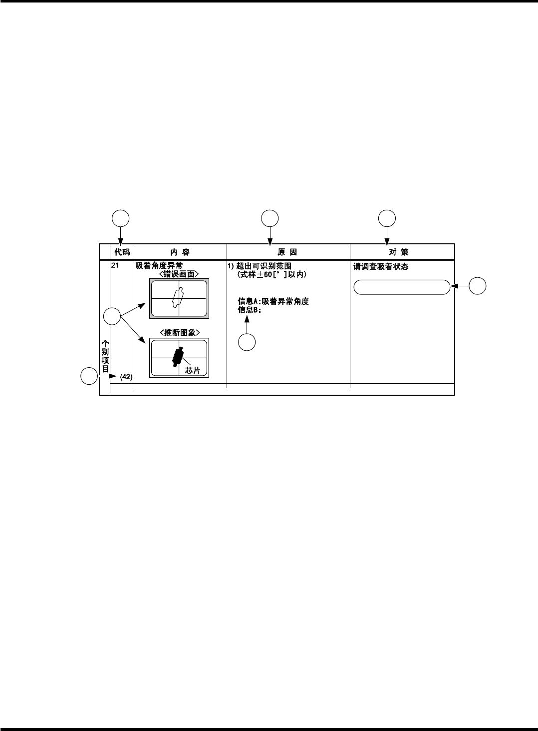 HGR14 附录 1.4 轮廓 识别错误信息 附录 1-66 个别项目 编号 内容 20 特征符号规定数 以外 21 式样或者吸着角 度异常 22 参考编号的错误 设定 23 芯片数据(输入 参数)的错误设定 24 25 L (长度) 异常 26 W (宽 度)异常 27 L (长度) 或者 W (宽度) 异常 28 29 30 P (间距)异常 31 ( 引线数 ) 异常 32 引线宽度异常 33 引线列等不在一 条直线上 34 …