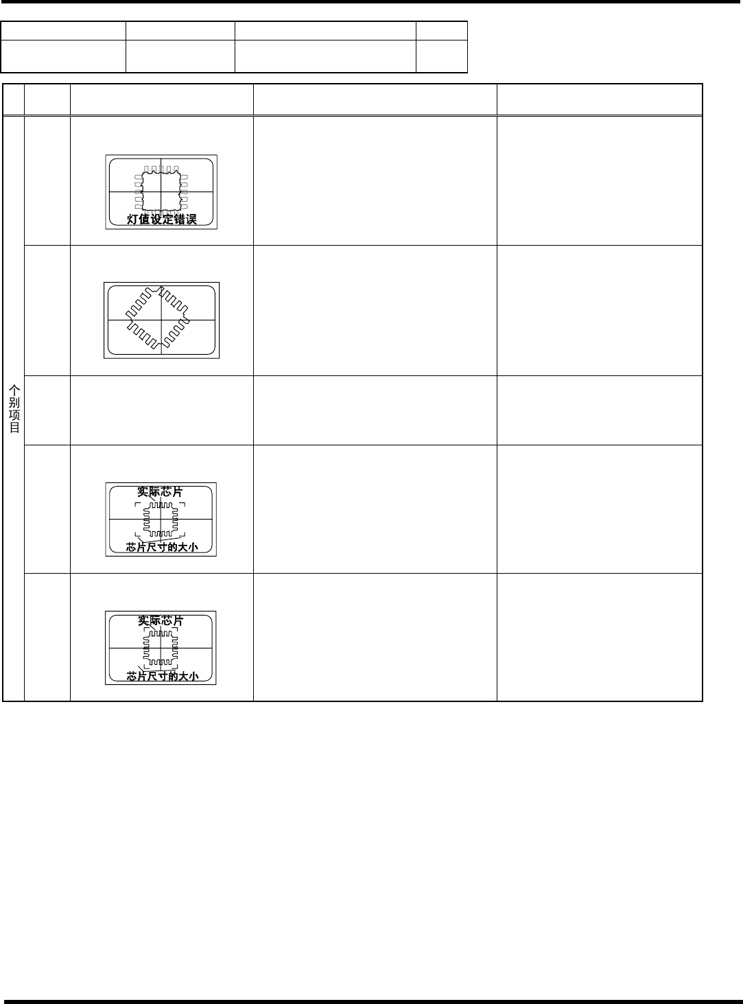 HGR14 附录 1.4 轮廓 识别错误信息 附录 1-98 参考 No. 形状编号 类别 166 ~ 17 0, 171 ~ 19 2, 193, 196 4b, 4d, 4g, 4h, 4k SOP 、 QFP 等 1/2 代码 内容 原因 对策 1) 引线信息 ( 引线数、 临时引 线数、 引 线间距、引线缺 数据)设定错误 请正确设定引线 信息。 (芯片数据) 20 (0) ~(4 ) (20) 特征符号在规定 外 < 错…