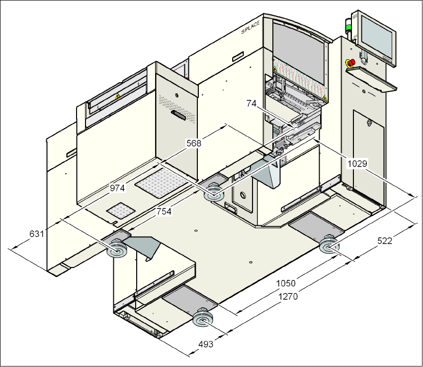 Návod k obsluze SIPLACE D1/D2 3 Technická data automatu Od verze software SR.605.xx Vydání 07/2008 CZ 3.4 Rozm ě ry a váha 105 3.4.4 Odstupy mezi nohami stroje 3 Obr . 3.4 - 3 Odstupy mezi nohami stroje