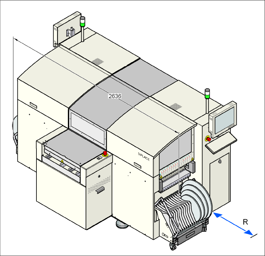 Manévrovací odstup R vozíku součástek na automatu je 1200 mm.