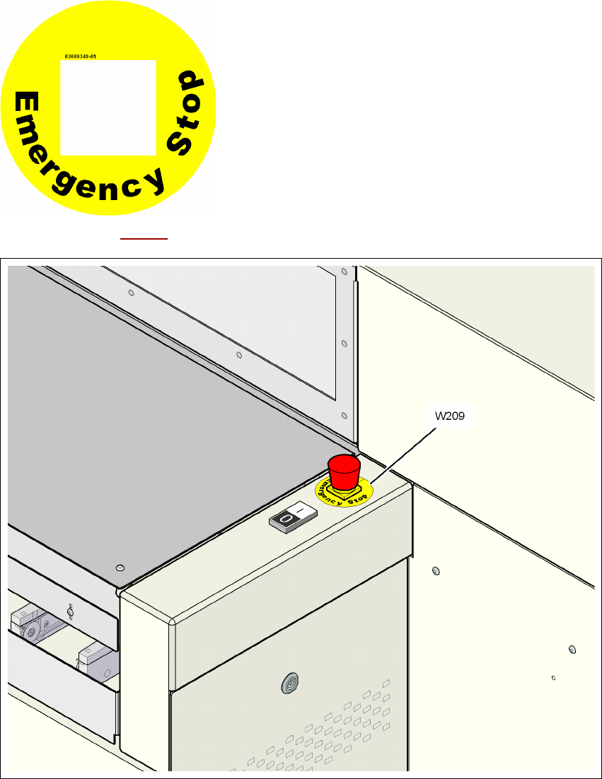 Obr. 2.2 - 11 Výstražný štítek W209 na nouzových stop tlačítkách