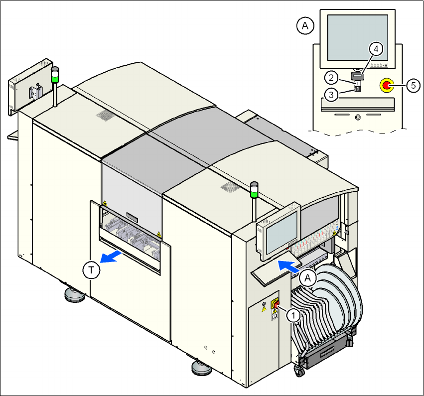 (5) Tlačítko nouzového zastavení na ovládacím panelu na straně síťového napájení