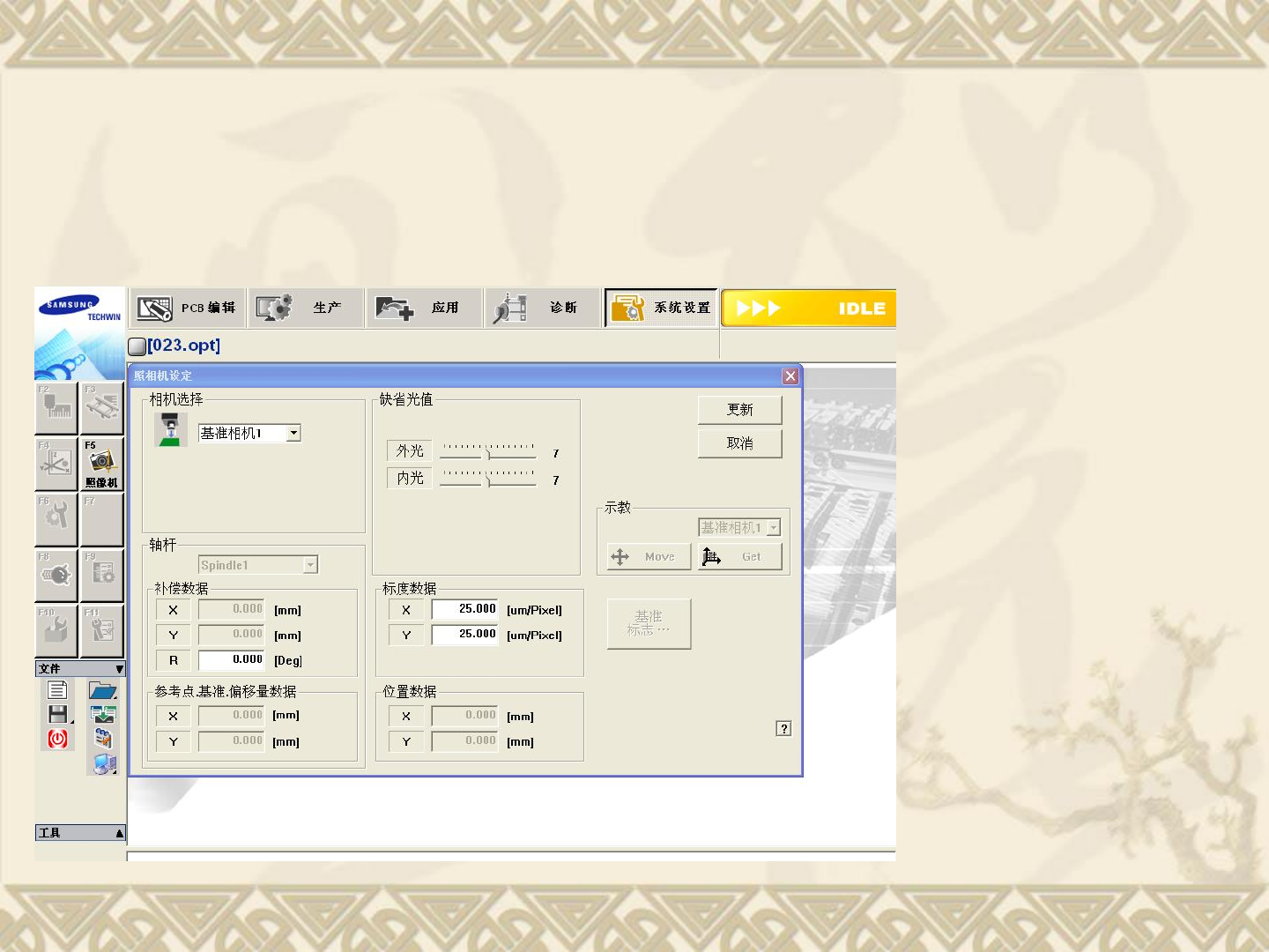 4 、子菜单: 照相机 菜单功能: 1 、设 定有 关摄 像 机的各 种数 据, 执 行 摄 像机的校 准(校正)功能。
