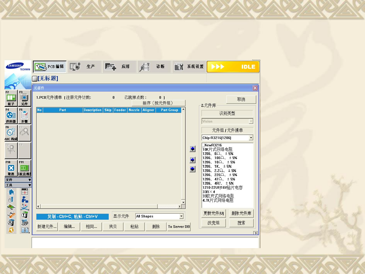2 、子菜单: 元件( F3 ) 菜单的功能: 1 、在资料库中选择元件的种 类和规格; 2 、资料库中没有的元件可以 在该菜单新建。 3 、在此编辑元件参数可用的 喂料器,吸嘴型号; 4 、生产正常后的元件资料可 以推送到元件组,用于下 次生产备用,如生产过的 元件直接推送到 PCB 元件 清单,可节省编辑元件时 间。 注意事项: 1 、 使用的吸嘴外 直径与元件宽 度相近,每 次编写元件名 称一致,可 有效后期元件 编辑。 2 、生…