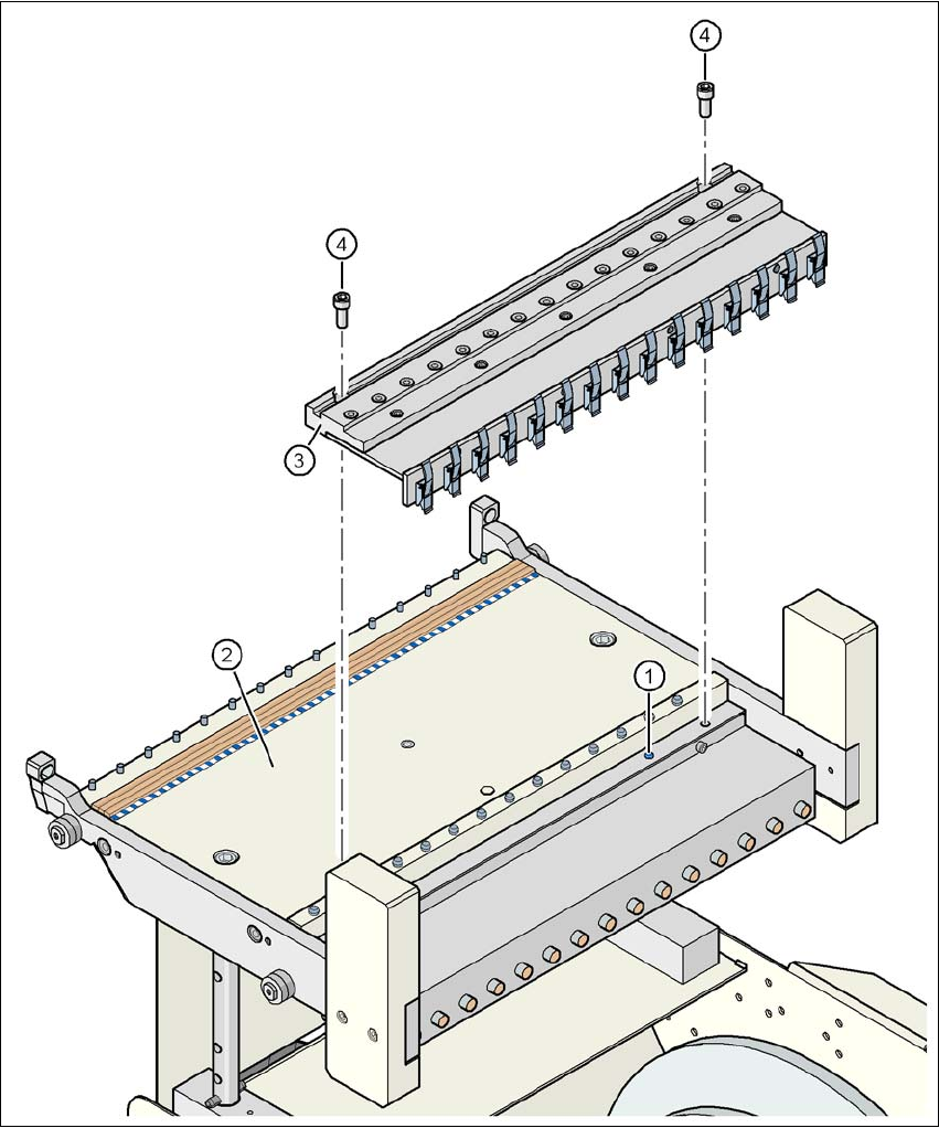 Die Zuführmodul-Fixierung ist an der Frontseite des BE-Tisches mit Schrauben befestigt. Die