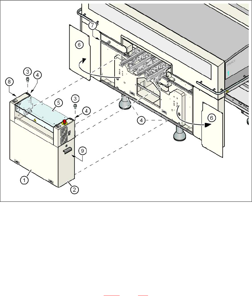 Betriebsanleitung SIPLACE X-Serie 4 Aufstellen und Inbetriebnahme Ab Softwareversion SR.605.xx Ausgabe 07/2008 DE 4.3 Den Automaten aufstellen 283 → Entfernen Sie beide Seit enbleche (P os. 6 in Abb. 4.3 - 15 , Seite 282…