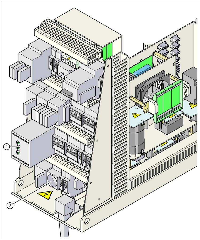 Die Schützsicherheitskombination ist im Stromversorgungseinschub untergebracht. Sie wird zur