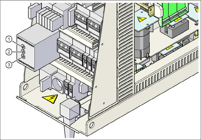 An der Frontseite der Schützsicherheitskombination befinden sich drei grüne LED für die