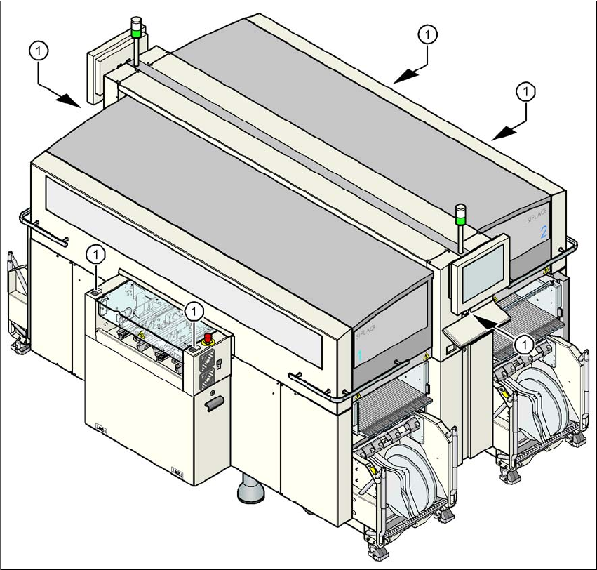 Betriebsanleitung SIPLACE X-Serie 2 Betriebssicherheit Ab Softwareversion SR.605.xx Ausgabe 07/ 2008 DE 2.6 Sicherheitseinrichtungen 75 2.6.2 Schalter und T aster am Automaten 2.6.2.1 Lage von Schaltern und T astern am A…