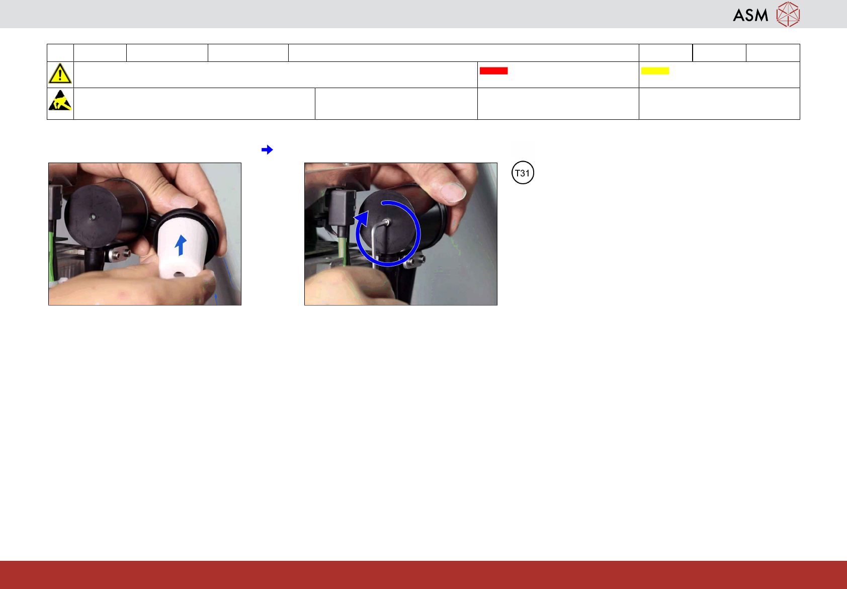 11 WF 3 TX 系列 维护 清洁/更换贴片头废气滤芯 5分钟 1 / 2 注 意 开 始 维 护 前 , 请 参 阅 用 户 手 册 中 的 安 全 说 明 贴片机状态 关闭 传送导轨空 注意!遵守防静电守则 工具: T31 易损件: W21 耗材: C19 www.asm-smt.com 1 拧开螺钉。 2 取出滤芯。 3 将灰尘吹出。 4 检查滤芯是否干净。 5 如正常,转至步骤 7。 6 如不正常,则请更换一个新滤芯。