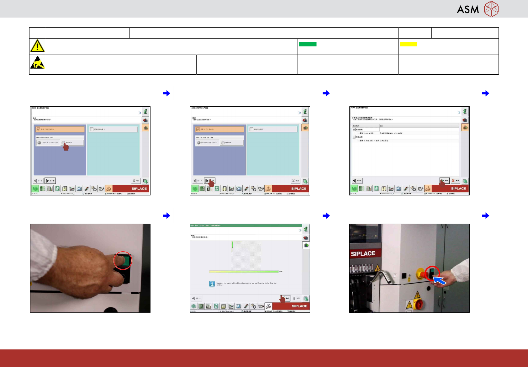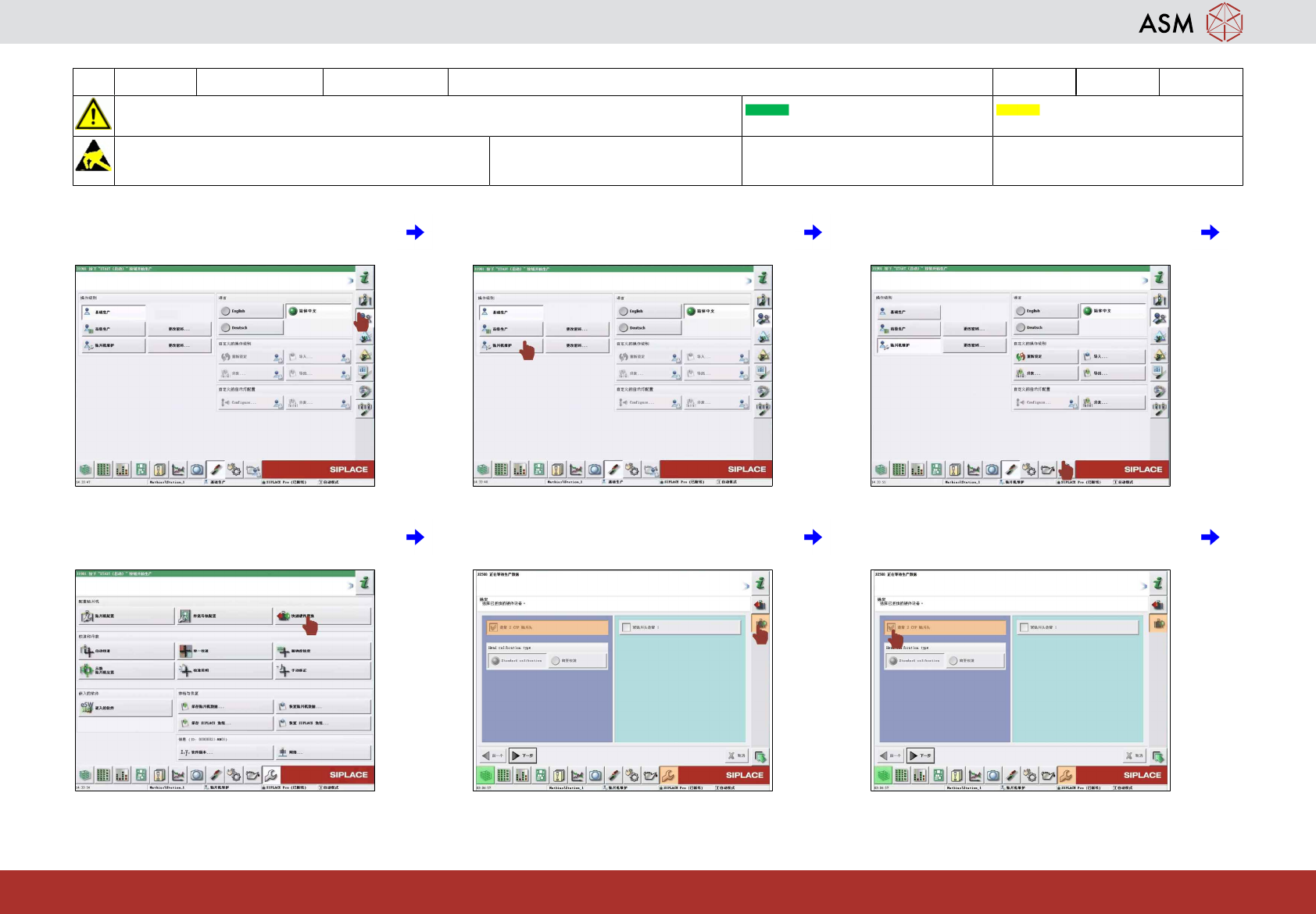 18 WF 3 TX 系列 维护 校准 CPP 贴片头 14分钟 2 / 4 注 意 开 始 维 护 前 , 请 参 阅 用 户 手 册 中 的 安 全 说 明 贴片机状态开启 传送导轨空 注意!遵守防静电守则 工具: T2、T5 易损件: 耗材: www.asm-smt.com 7 点击“User Settings(用户设置)” (1) 图 标。 8 点击“Machine Service(贴片机服务)”图 标。 9 点击“Cali…
