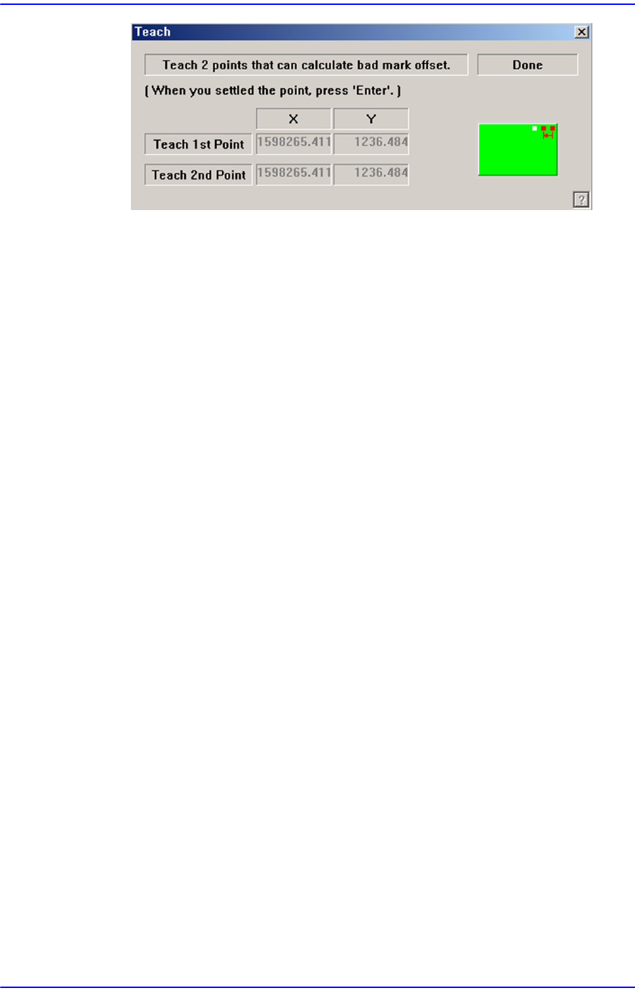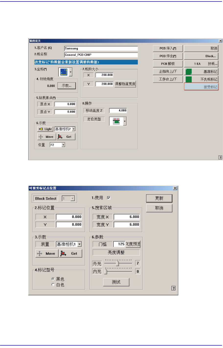 6-31 Board 定义 坏标记的状态可以适当调整照 明度。 < 测试 > 按钮 利用已设定的标记的数据检查标记 。 通过它可以确认设定值 是否正确。 成功地 结束检查后显示以下的信息框。 检查失败时, 显示 以下的信息框。 < 确定 > 按钮 储存坏标记的数据后, 关闭” 坏点位置 ” 对话框。 坏点 位置 < 取消 > 按钮 不储存坏标记的数据直接关闭” 坏点位置” 对话框 。