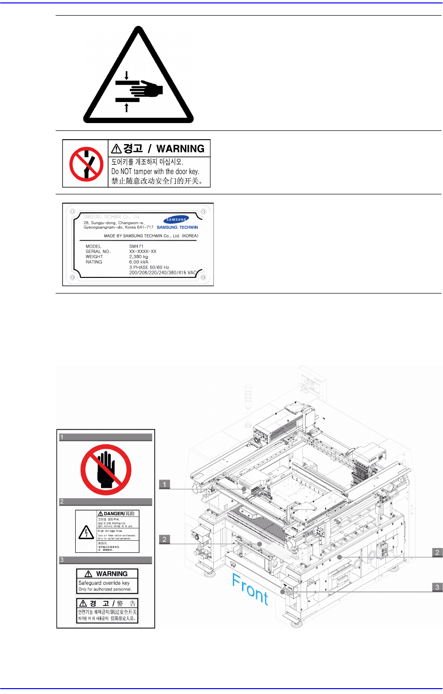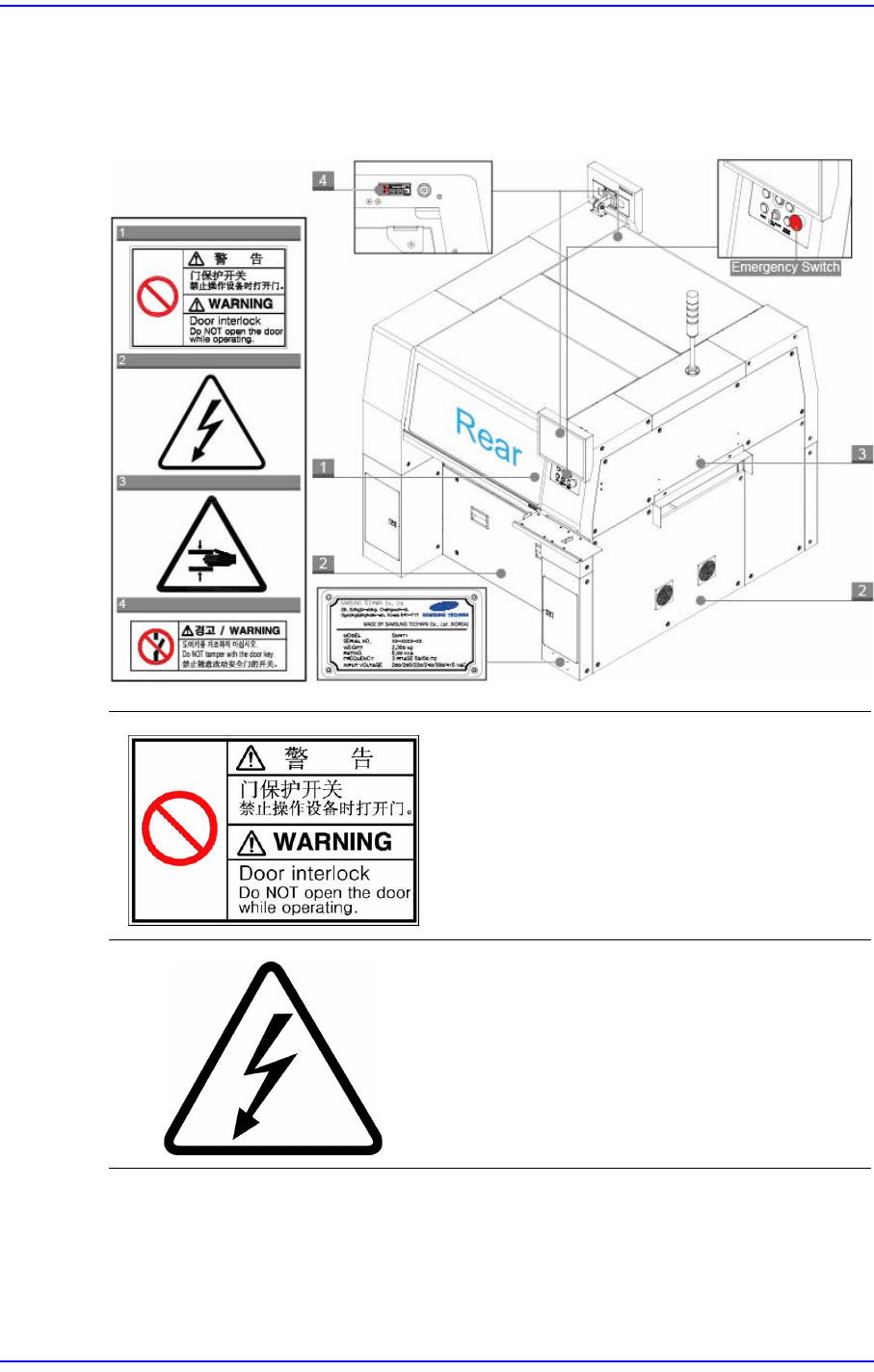 前言 xi 设备后面 设备后面贴有以下标签 图 1.6 设备后面的安全标签 运行中请勿打开门 贴有此标签处有移动体, 驱动中打开门把身 体的一部份伸进设备内部时非常危 险。 盖内侧及周围连接物部位存在高电 压要注意 电击危险。 在维护和修理设备操作时一定要先 切断主电 源。