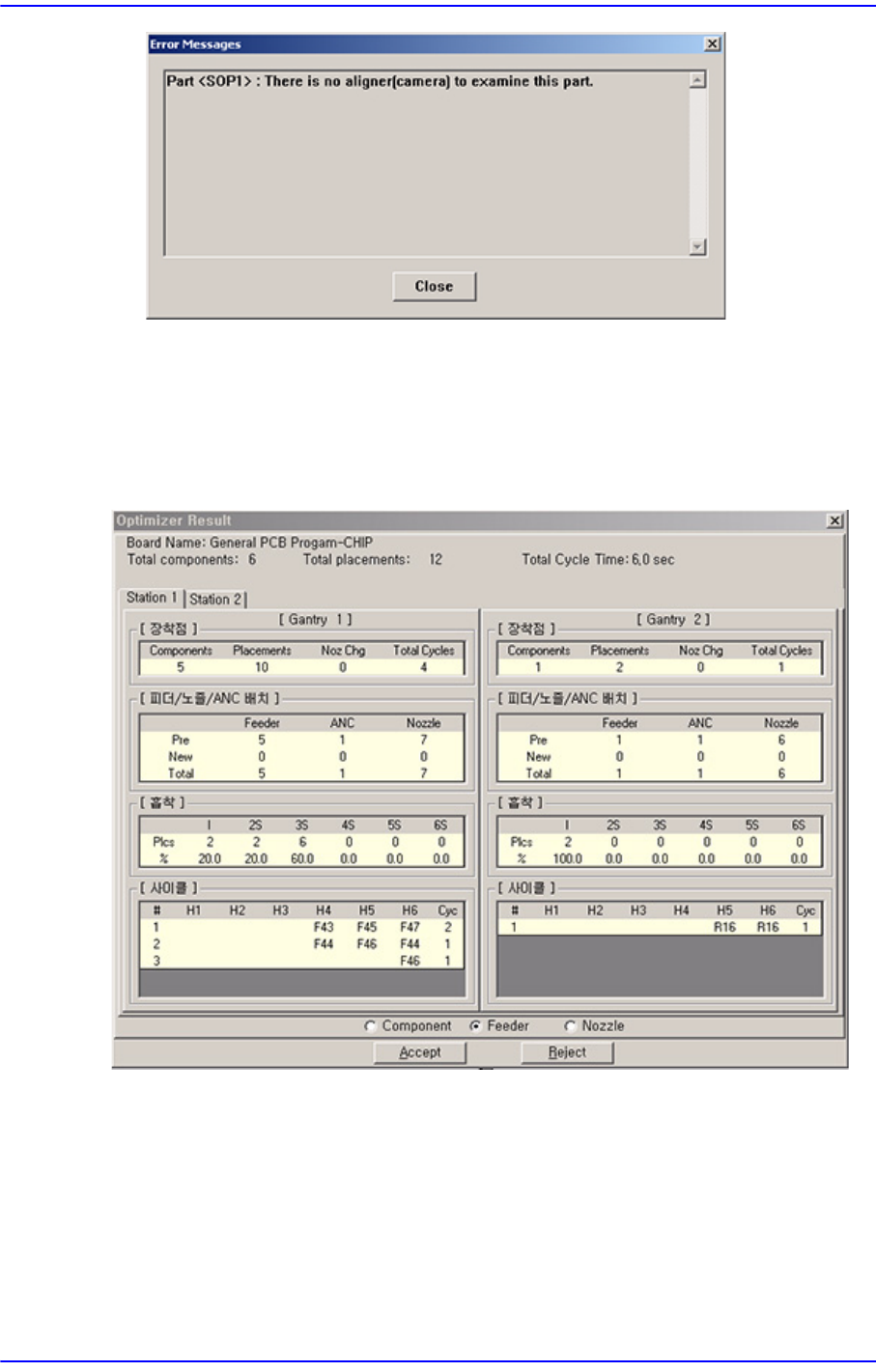 10-13 Optimization 于模拟的估测值, 由于不 包括部品识别不良等要素, 可能会与设备实际装贴时 间多少有些差异。 <Arrangement> 领域 在这部分显示带式喂料器, ANCs 和吸嘴的配置状态。 Pre: 使用者直接配置的数量 New: 表示在优 化重新配置的数量 T otal: 总的配置数量 <Pickup> 领域 在这部分显示部品同时吸取的分布 。 在这部分还显示…