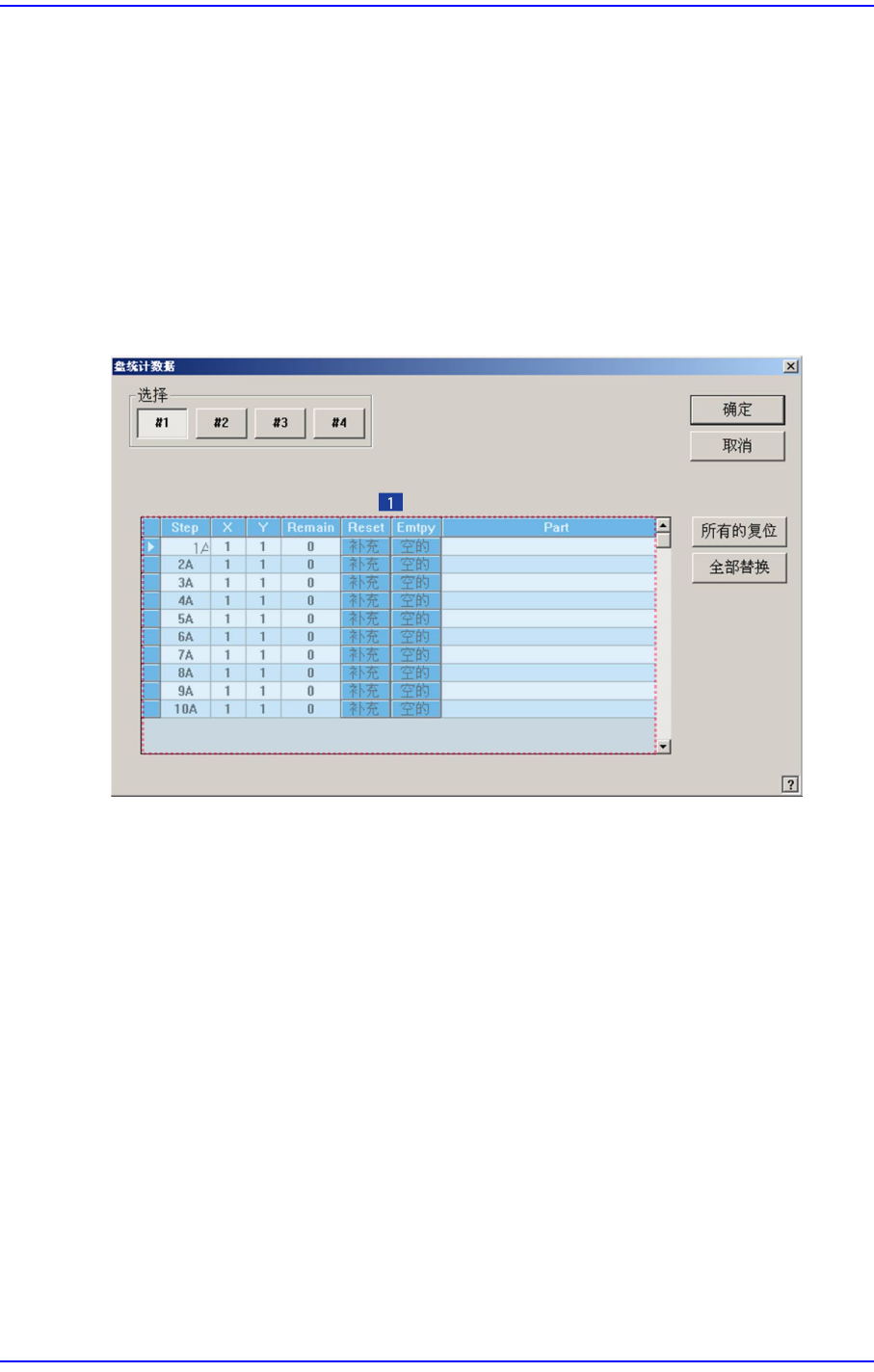11-17 Production Setup 11.5. 完成 ( Finish ) [F5] 此菜单执 “行把” 完全终止有关下载的 PCB 数据的贴 装作业” 的命令输送到设 备的 功能。 11.6. T/F 数量 [F6] 设定从盘式喂料器吸着部品的 Pocket 的开始位置 。 单击此按钮时显示如下 的对话 框。 图 11.7 “盘统计数据” 对话框 1: Grid 领域 < 选择 > 选项按钮 选择需要设定的盘…