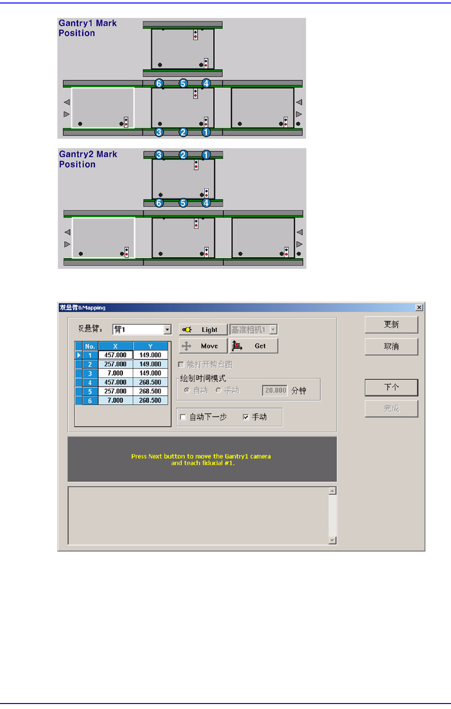 12-36 Samsung Compon ent Placer SM471 Administrator ’ s Guide 12.3.8. Gantry Mapping 可以校准作为拱架映射 (Gantry Mapping) 基准的基准标记 位置。 执行校准时, 需要示 教输送带上的 6 个基准标记点。 示 教顺序如下 : 必须 先示教固定轨 (fixed rail) 上的基 准标记, 同一轨道上的基 准点则应该从右侧开始到左侧的方 式…