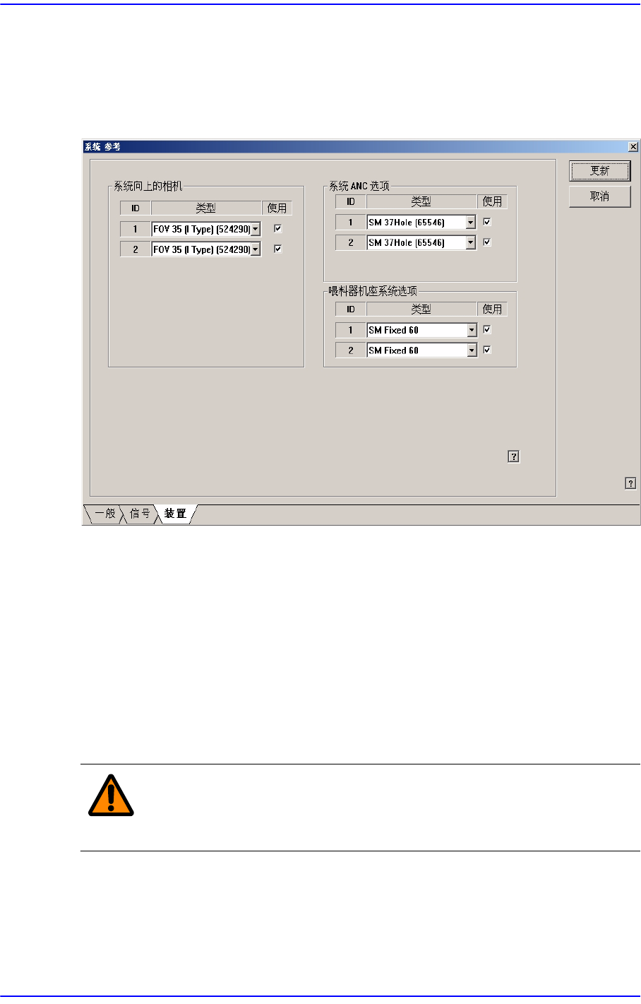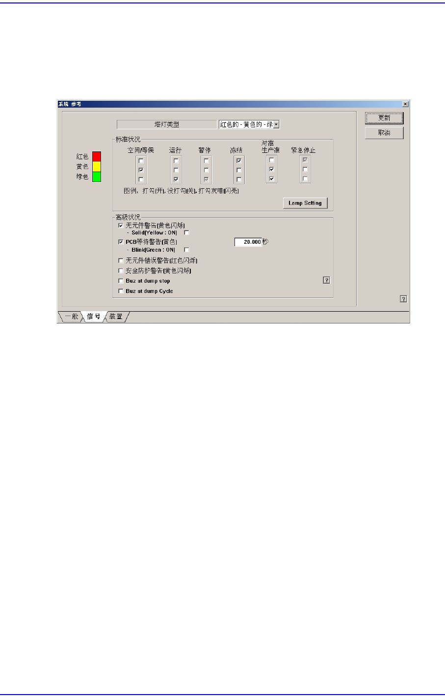 13-23 系统设置 < 更新 > 按钮 把设定的数据传送到设备之后关闭 对话框。 以下是信号灯 Default 设定 相应的设备状态。 黄色灯亮灯时 设备在 IDLE 或 WA I T 状态下处于不进行作业或作业等待状态 。 绿色灯亮灯时 设备在 RUN 状态下处于作业状态。 绿色灯灭灯时 设备在 P AUSE 状态下作业中 处于暂停状态。 红色灯亮灯时 设备在 FREEZE 状态 下由于作业中发生故障…