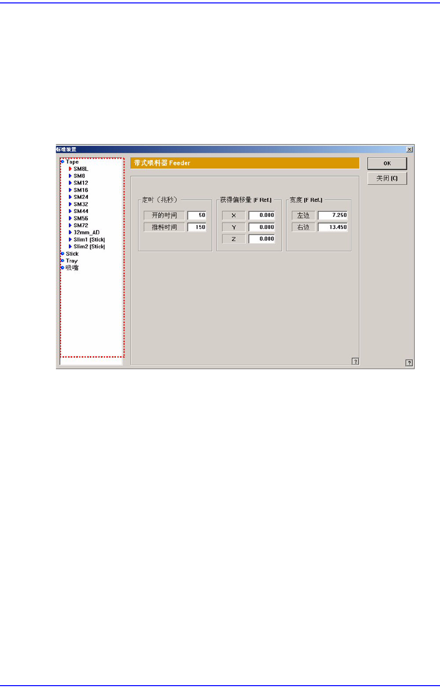 设定带式喂料器的吸着点位置的偏移量。设定带式喂料器安装在设备的前面为