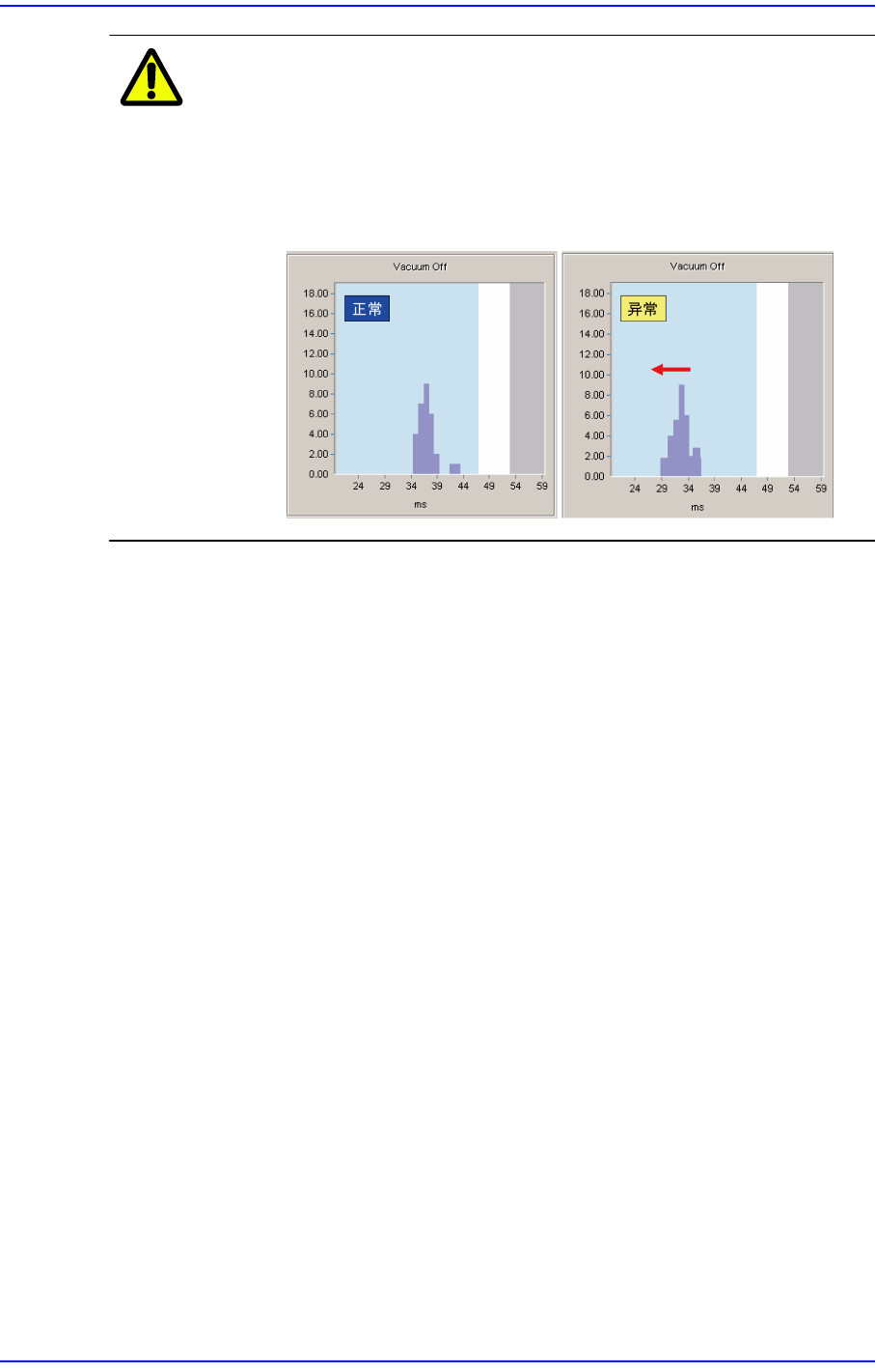 14-13 Diagnosis( 诊断 ) 注 意 真空过滤器 (Vacuum Filter) 的清扫越是不良, 越会提早出现破坏 真空 (Vacuum Off) 的现象。 如下图所示, 以平均值为基准, 如果 结果值偏布于左侧就更换真空过 滤器。 否则, 电磁阀会受损而最 终影响到设备性能 ( 真空过滤器 : 更换周 期 6 个月 ) 。 <Close> 按钮 关闭对话窗口。