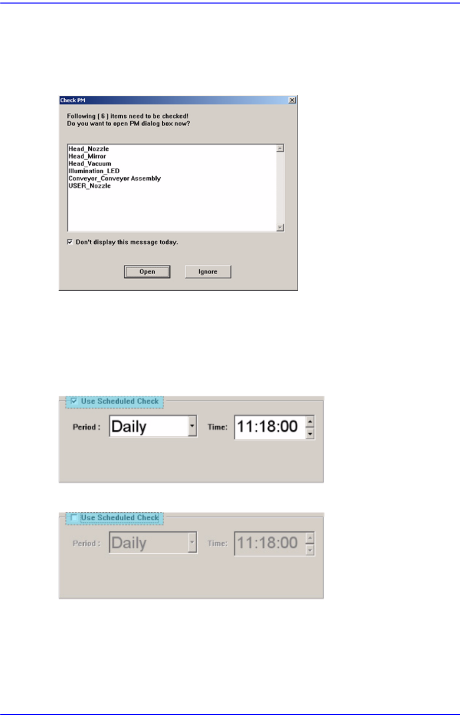 17-8 Samsung Compon ent Placer SM471 Administrator ’ s Guide 17.3.8. 预约检查功能 预约检查功能在使用者指定的时间 内提示需要检查的项目。 到使用者设置的时间, 会如下显示需要检查的项目数量和 检查项目。 图 17.8 预约检查提示画面 点击 <Open> 按钮时显示可措施检查项目的 PM Manager 窗口, 点击 <Ign ore> 按钮时…