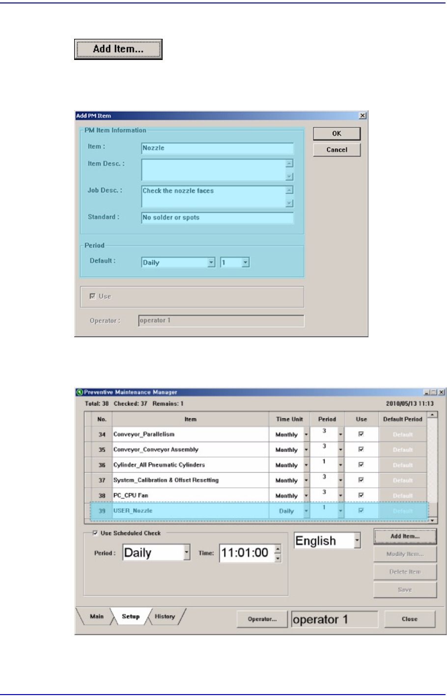 17-11 PM Manager 点击 <Add Item … > 按钮执行’ Add PM Item ’ 对话框。 在’ Add PM Item ’ 对 话框中输入要增加的项目后, 设置检查周期。 图 17.10 增加使用检查项目 点击 <OK> 按钮增加使用者检查项目 时, Set up 画面中会增加新的检查项目。 图 17.11 增加的使用者检查项目