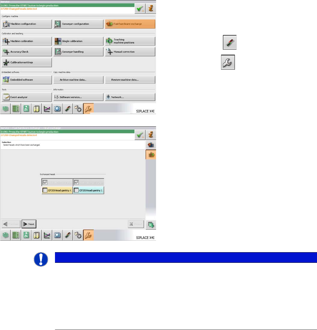 Service Work 3.4.1 Fast Head Exchange Placement heads Service Manual SIPLACE X Series 125 ► Refill the nozzle changer g arages of the nozzle changer with the relevant nozzles. NOTICE! You can skip refillin g the garage s…