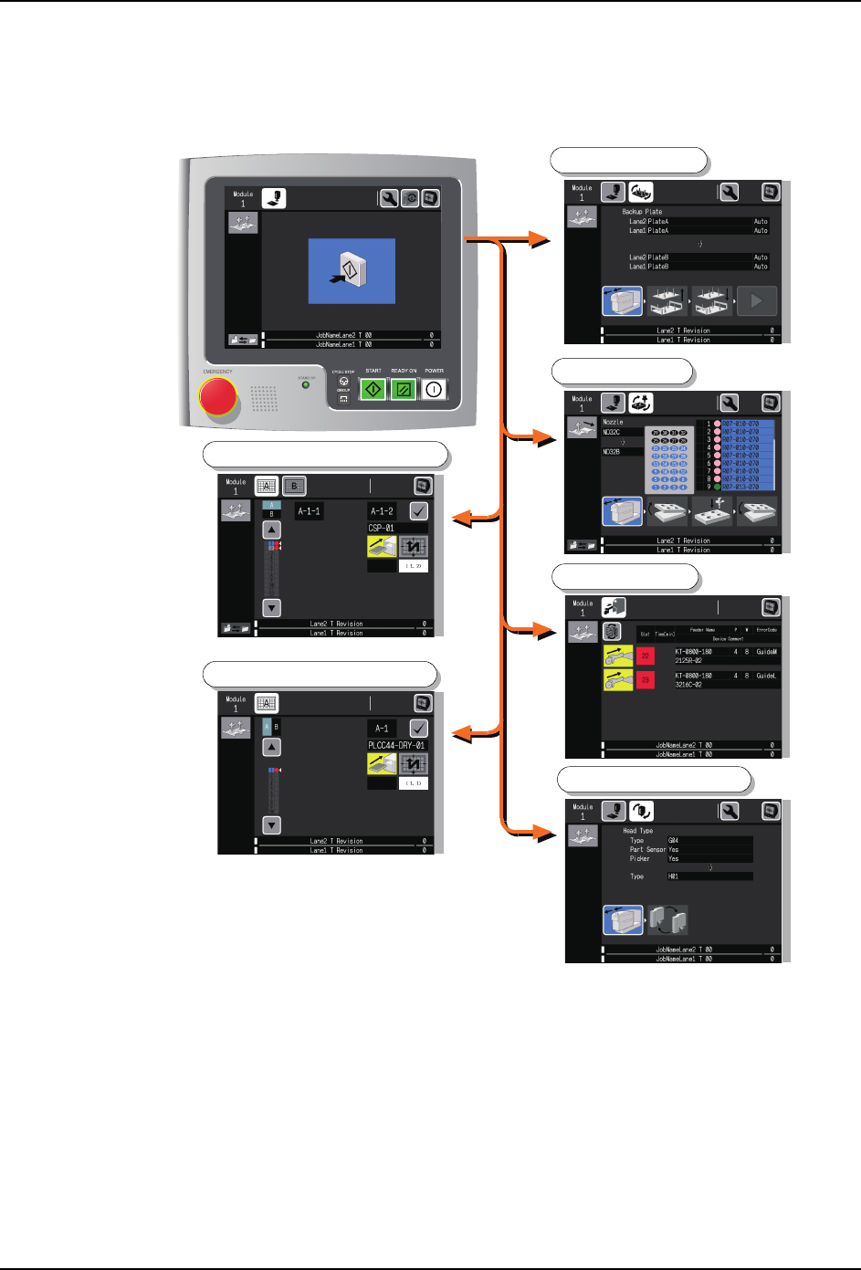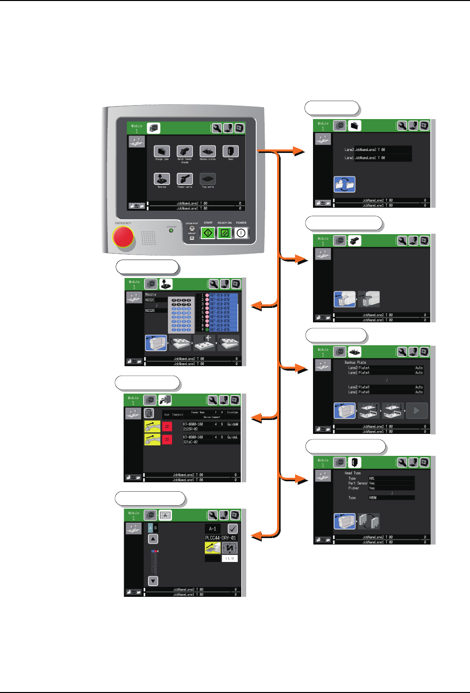 SYS-NXT3c-007S0 4. 生产准备 NXT III/NXT IIIc 系统手册 79 4.2.3 换线菜单中可以选择的更换向导 操作者也可以选择换线的项目 来显示向导画面。 这时, 将 STAR T 等待画面切换到换线菜单画面。 画面的切换方法请参照 "3.4 显示换线信息 画面 "。 01SYS-0680S ࣀࢬࣝ ࠽ᦘ-RE ᴪᦘᐛ֒ཪ ࣀࢬࣝ ᴪᦘ੮౪ ᴪᦘבᯏಞ ᴪᦘᯏⴎݹԬ ᡆᴪᦘבᯏ…