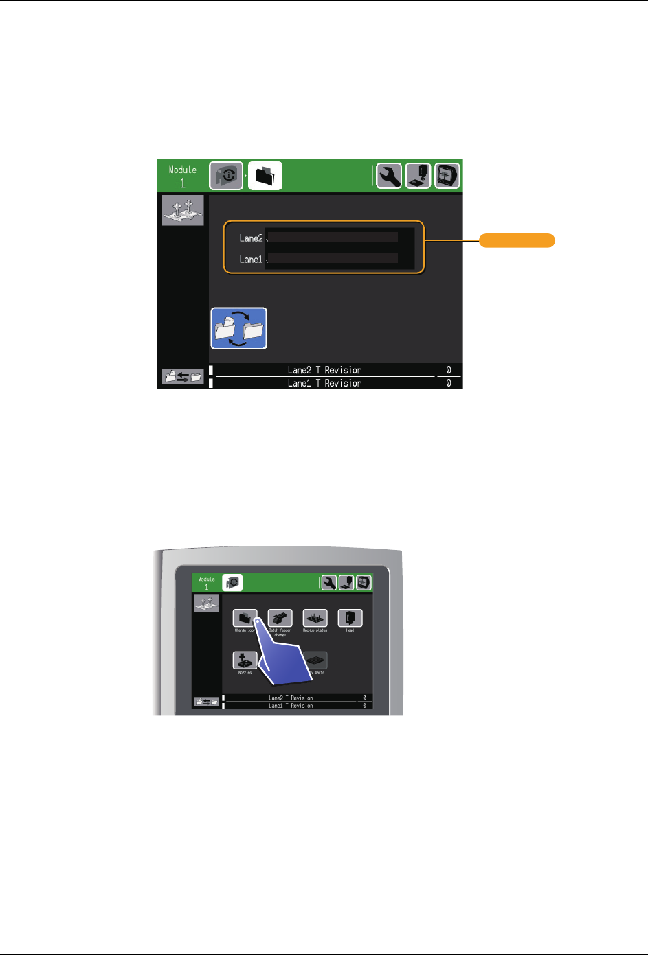 4. 生产准备 SYS-NXT3c-007S0 82 NXT III/NXT IIIc 系统手册 2. 显示切换 Job 画面。请按下 「切换 Job」 。 3. 切换 Job。 01SYS-0685 01SYS-0675