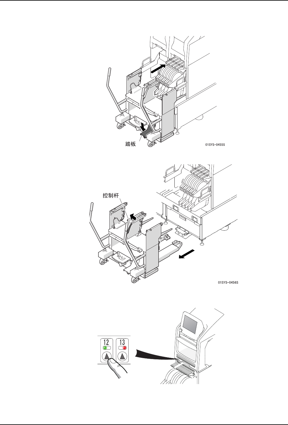 SYS-NXT3c-007S0 4. 生产准备 NXT III/NXT IIIc 系统手册 89 4. 请踏下踏板,将料站托架推入模组 内。 备注 )自动夹紧料站托架。 5. 请握住手 柄慢慢拉出 PCU-2(c)。 6. 请按下安装供料器的料槽 No. 的安装按钮。 备注 ) 请按下所有红色 LED 亮 灯的按钮。 01SYS-0666