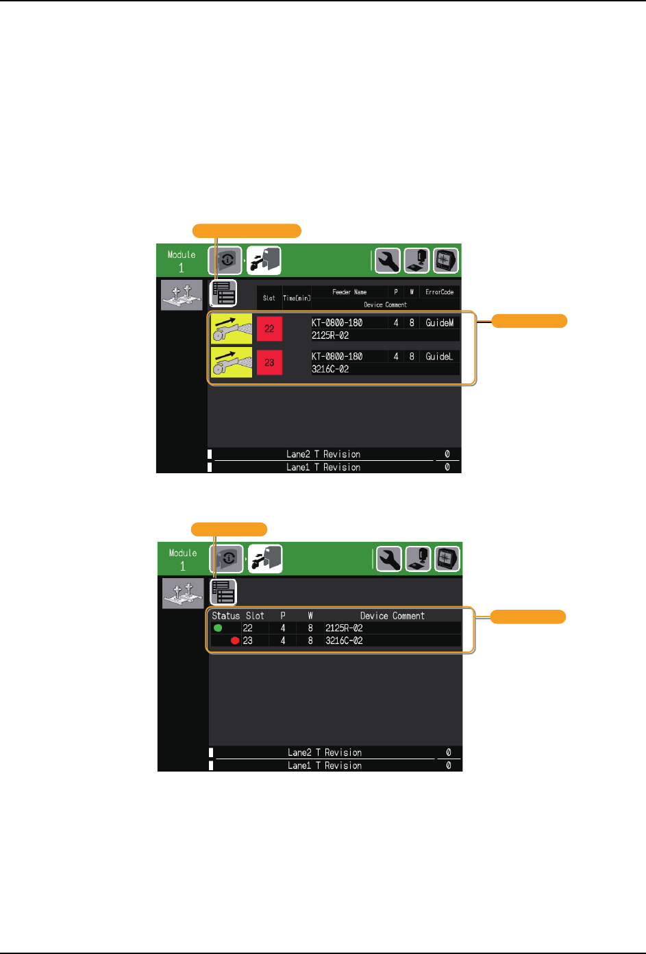 在 [ 列表显示 ] 画面上,可以知道安装供料器的位置。供料器数量多的时候,请滚动列表查