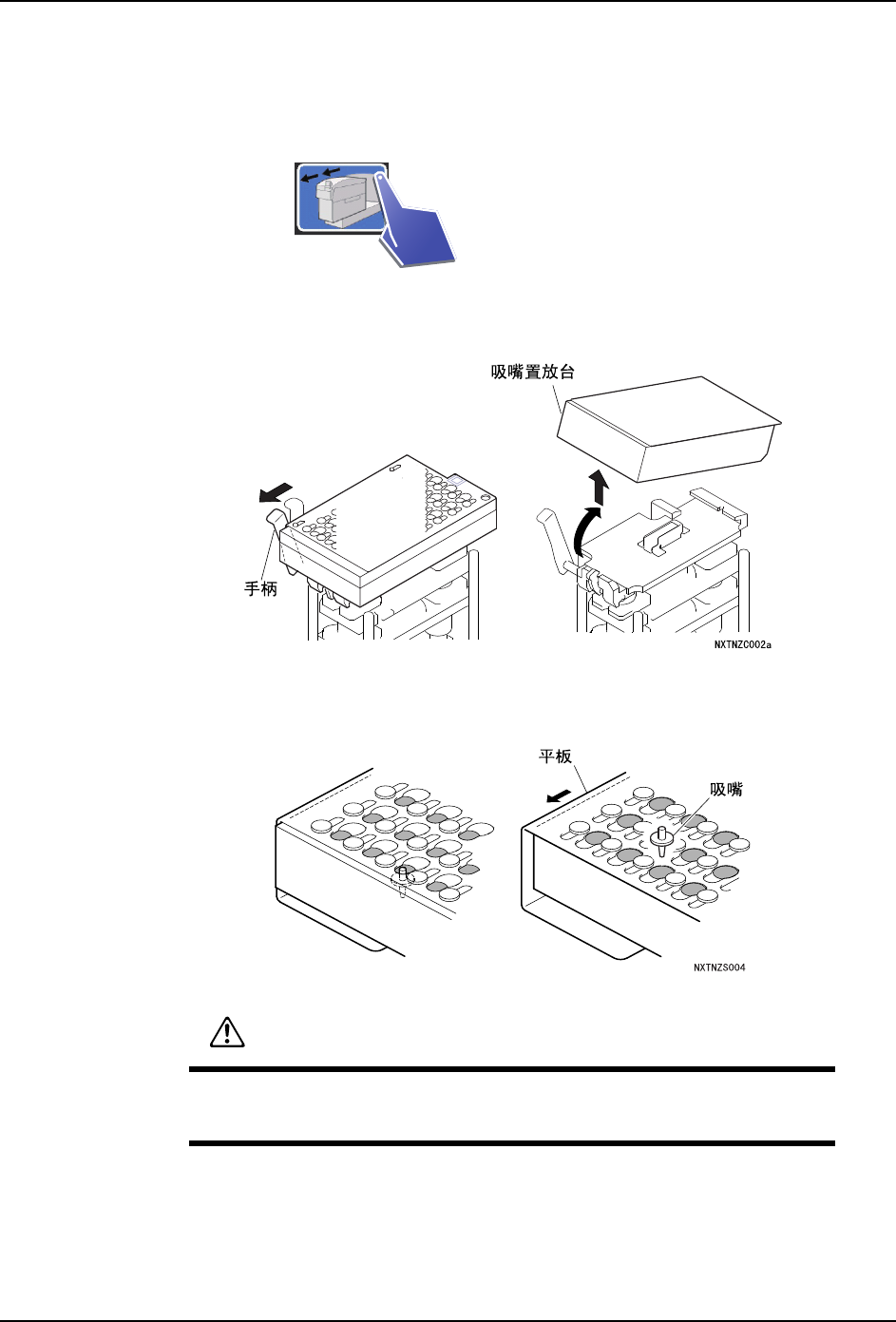 2. 将吸嘴置放台的手柄向模组前方倾斜,把置放台的前半部分向上抬起并拆除。