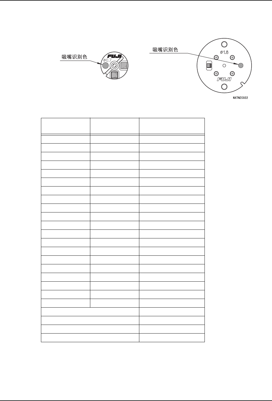 所使用的吸嘴种类如下。请通过涂敷在法兰盘上的颜色来识别各个吸嘴。