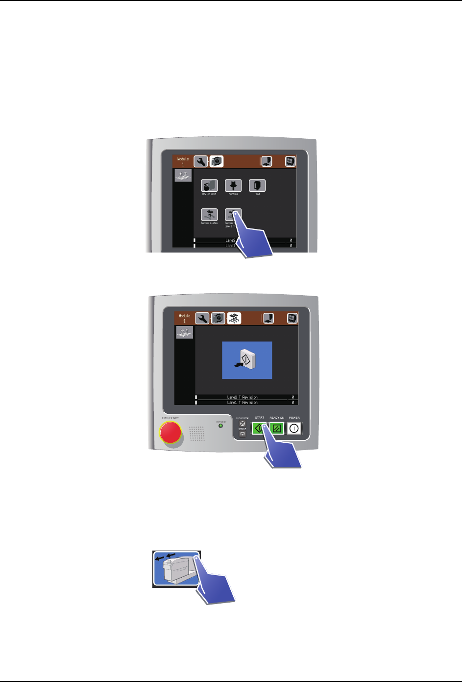7. 手动模式指令的操作 SYS-NXT3c-007S0 326 NXT III/NXT IIIc 系统手册 6. 请插入模组。 a. 在插入模组之前,请确认 XS 轴 (M3-3)等机械部位没有从模组的旁边突出。 b. 请握住模组的手柄,缓慢地插入模 组,直到碰到阻停块为止。 c. 自动地夹紧模组。没有夹紧时,请 稍微拉回模组然后重新推入。 备注 ) 如果卸下了料盘装置,此处就会显示料盘装置推入向导。 将料盘装置推入到模组后, 就会自…