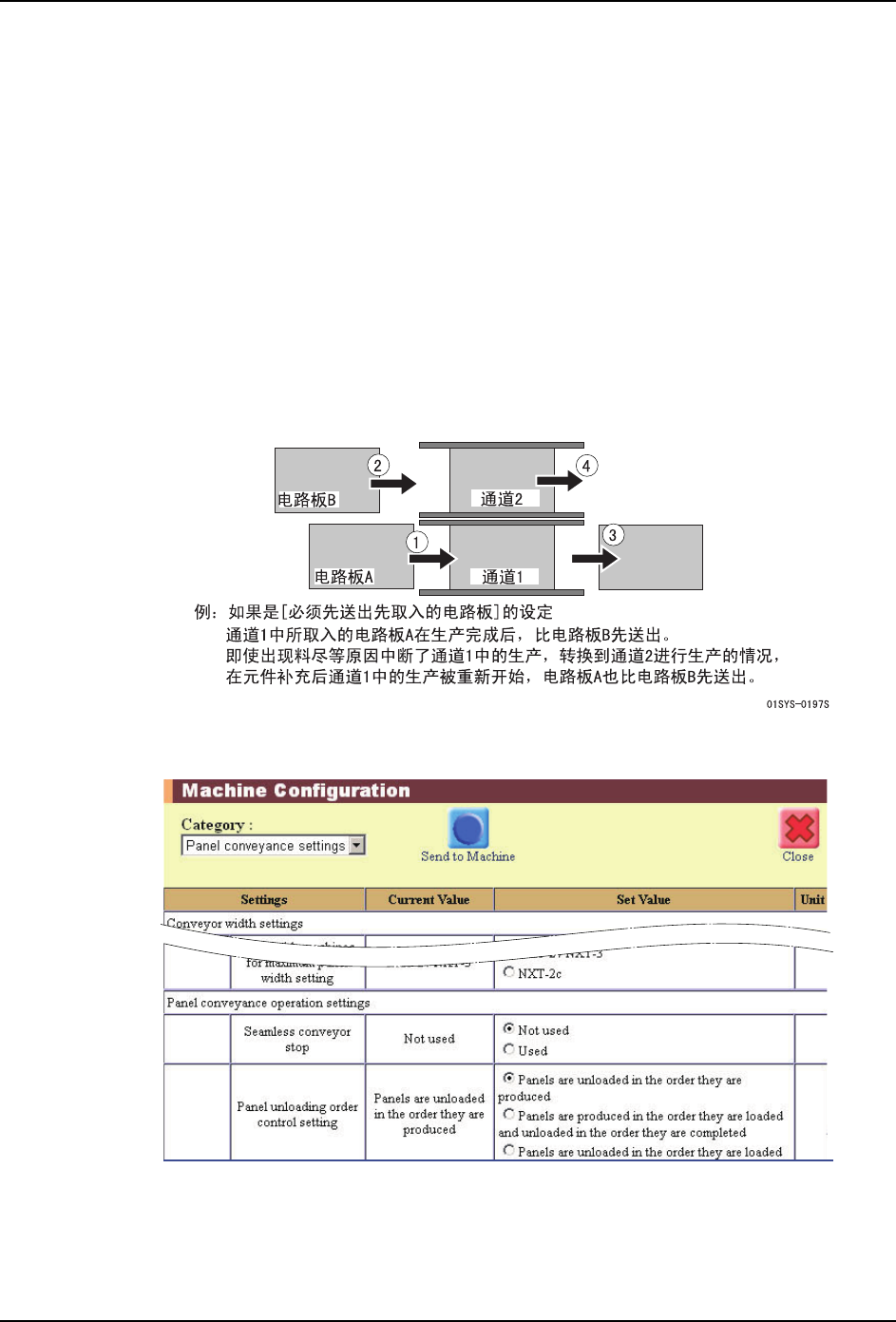 SYS-NXT3c-007S0 9. 各种功能的设定和管理 NXT III/NXT IIIc 系统手册 371 9.2.7 设定电路板送出顺序 在进行双轨道生产或三轨道生产 时, 可以从以下 3 项中选择各自轨道中所生产的电路板的送 出顺序。 ·[ 在可生产的轨道中进行生产后送出电 路板 ] • 「先导入的电路板优先生产并 送板」 ·[ 必须先送出先取入的电路板 ] 初始设定为 [ 在可生产的轨道中进行生产后送 出电路板 ], 各自轨道…